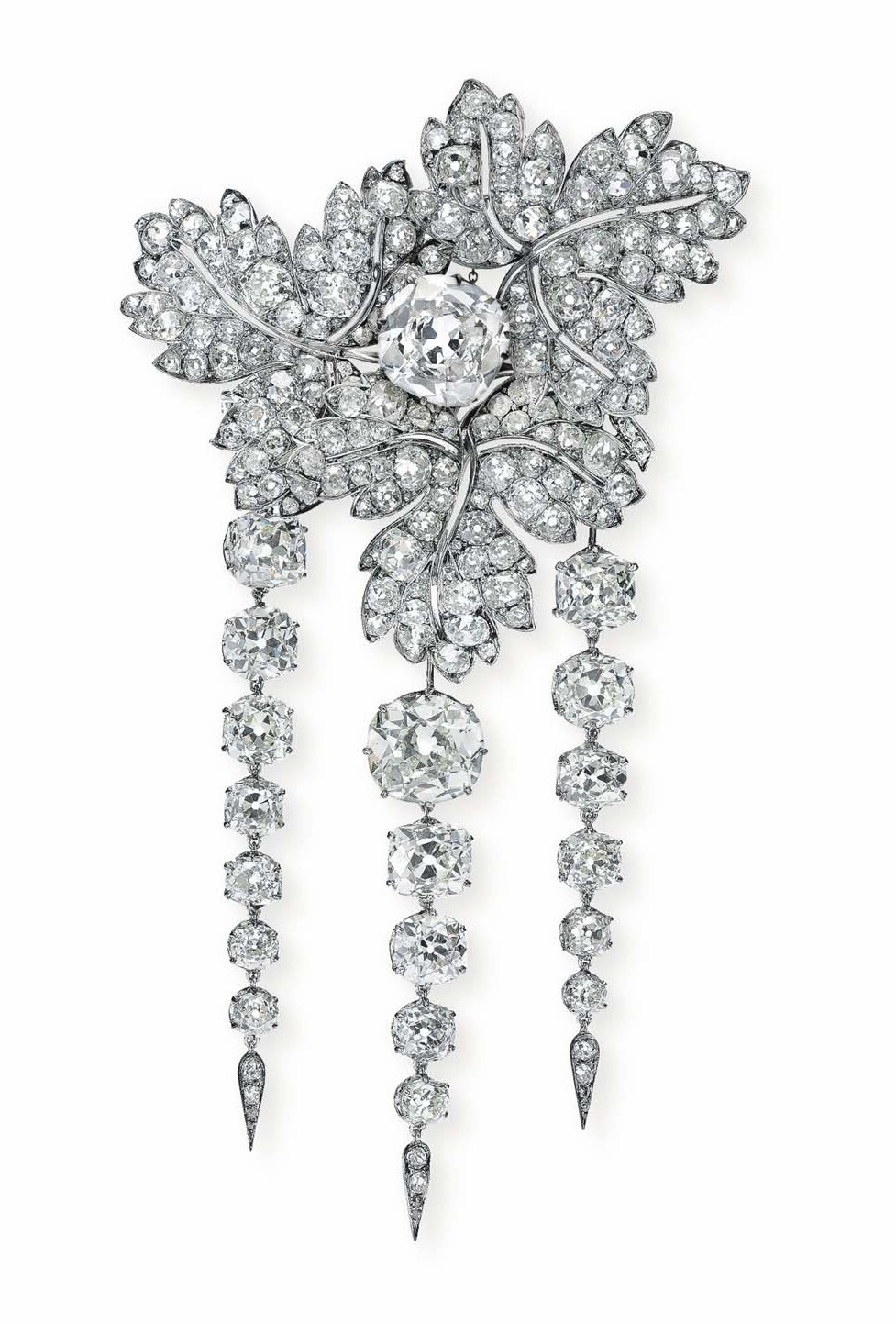 Эта брошь первоначально принадлежала императрице Евгении де Монтихо, жене Наполеона III. "Feuilles de Groseillier" в переводе с французского означает «лист крыжовника». В июле 1855 года императрица Евгения заказала у французского ювелира Альфреда Бапста 30 украшений в форме «листа крыжовника», и эта брошь была одной из них.