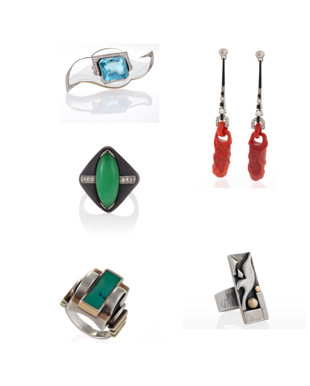 на фото: Брошь Mauboussin в стиле ар-деко с бриллиантами, аквамаринами, горным хрусталем и платиной; Кольцо Marsh & Co. середины XX века с жадеитом, бриллиантами, сталью и платиной. Ювелирная компания из Сан-Франциско, создавшая это кольцо, была известна сочетанием традиционных азиатских материалов, таких как этот жадеитовый кабошон, с окисленной сталью; Кольцо Jean Després с авангардными формами, включающее бирюзовый камень в оправе из безеля с объемными дугообразными боковыми элементами; Пара серег в стиле ар-деко с бриллиантами, ониксом и резным кораллом, около 1920-х годов. Эти серьги выполнены в классическом китайском стиле ар-деко; Кольцо Жана Депре, формы которого навеяны новыми формами и композициями, представленными авангардными течениями в искусстве