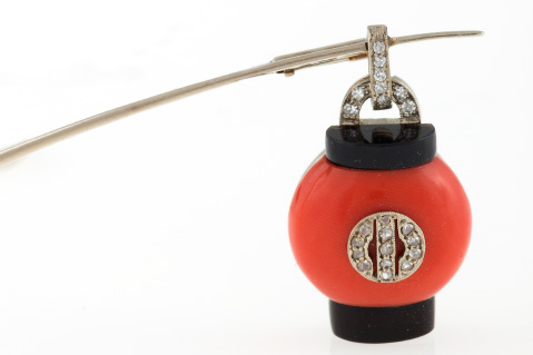 Брошь в стиле ар-деко с эмалью, бриллиантами, ониксом и кораллами, около 1920-х годов. Брошь выполнена в классическом китайском стиле ар-деко (фонарь — культовый китайский мотив)