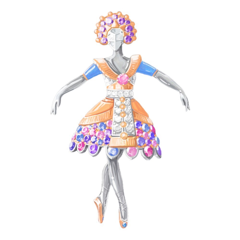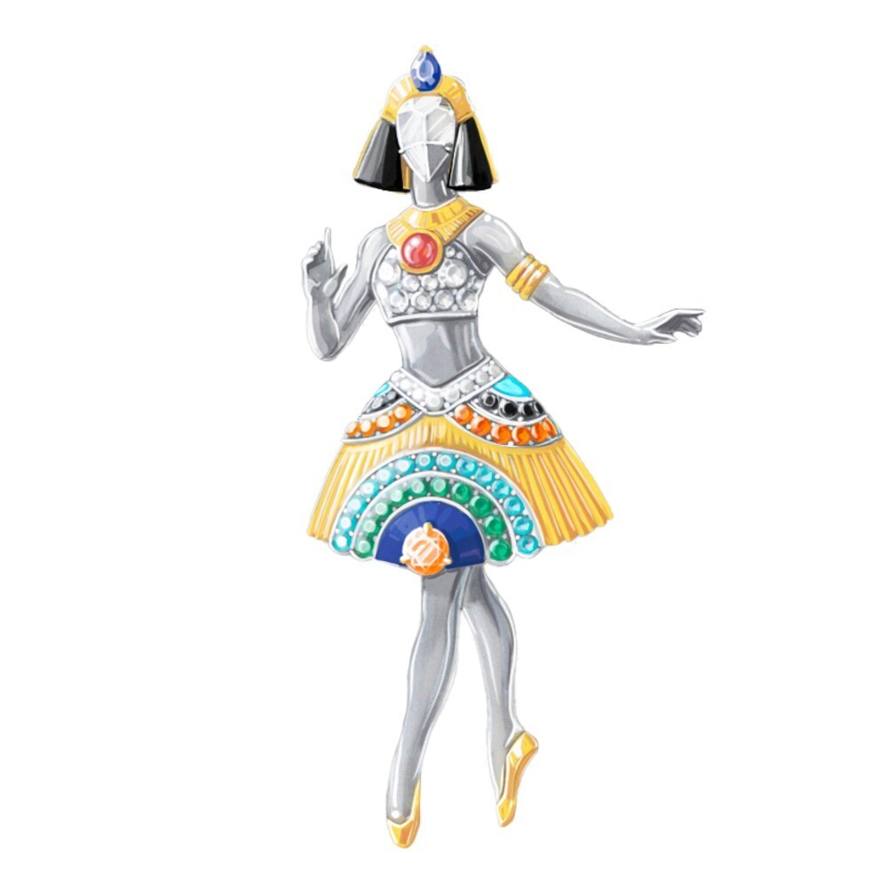 Восточная сказка: Брошь «Шемаханская Царица» переносит нас в мир балета 1929 года «Золотой петушок». Головной убор, напоминающий корону, лакированные рукава, бриллиантовый пояс и короткая юбка, украшенная яркими самоцветами, ярко воссоздают дух персидского танца.