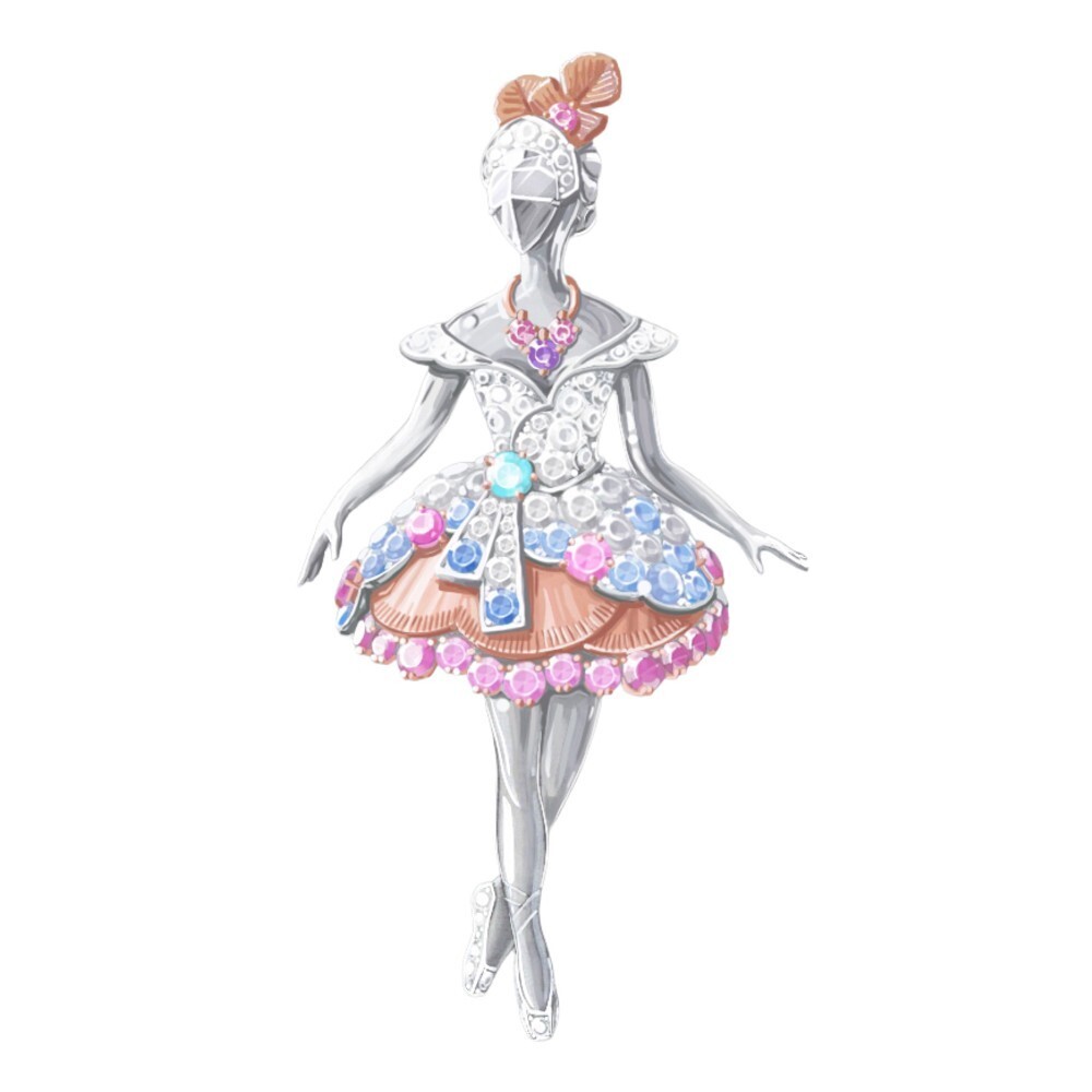 Каждое новое украшение – это воплощение самой узнаваемой и классической балетной позы. Мастера-ювелиры сначала кропотливо вылепили изящную фигуру танцовщицы и струящуюся пачку из золота. Затем, словно оживляя образ, они обрамили лицо балерины алмазом огранки «роза», а детали ее костюма украсили сверкающими бриллиантами и цветными драгоценными камнями, придавая силуэту мерцающее сияние.