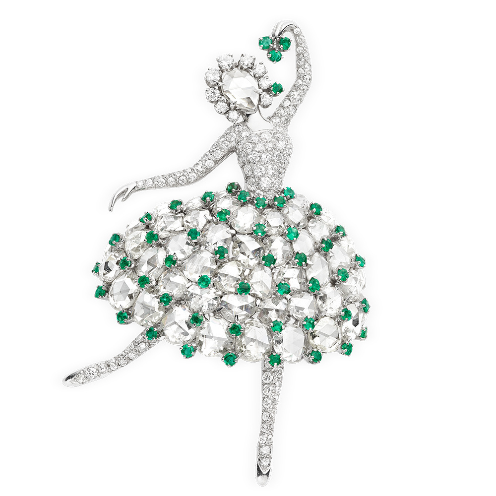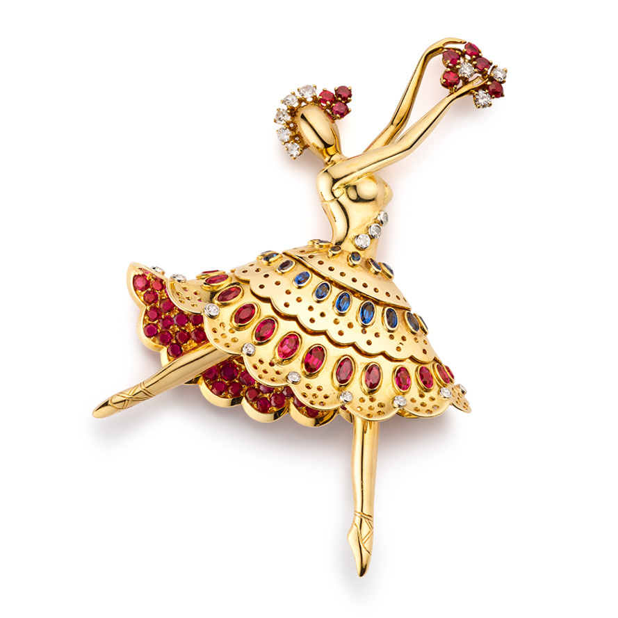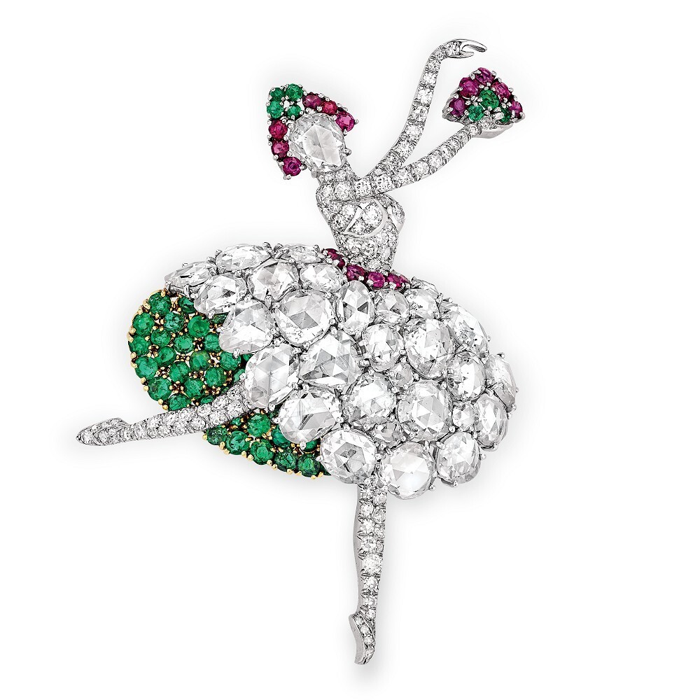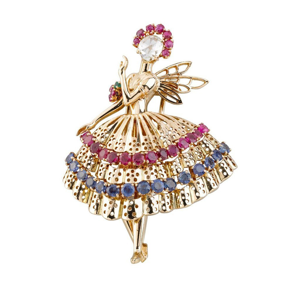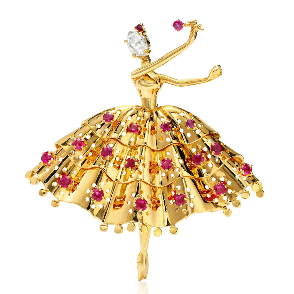 Выставка предлагает детальный обзор классических брошей «Балерина» 1940-х и 1950-х годов, разделённых на две группы согласно материалам и технике исполнения. Первая группа акцентирует блеск алмазной инкрустации: лицо балерины часто украшает грушевидный алмаз огранки «роза», а её изящные руки, ноги и струящаяся пачка мастерски выложены бриллиантами в технике «pavé». Для создания визуальной глубины и контраста детали костюма подчеркиваются цветными драгоценными камнями. Яркий пример — брошь «Танцовщица» 1941 года, где доминируют чистейшие бесцветные бриллианты, а подклад юбки, головной убор и веер расцвечены изумрудами и рубинами, создающими эффектное цветовое напряжение.