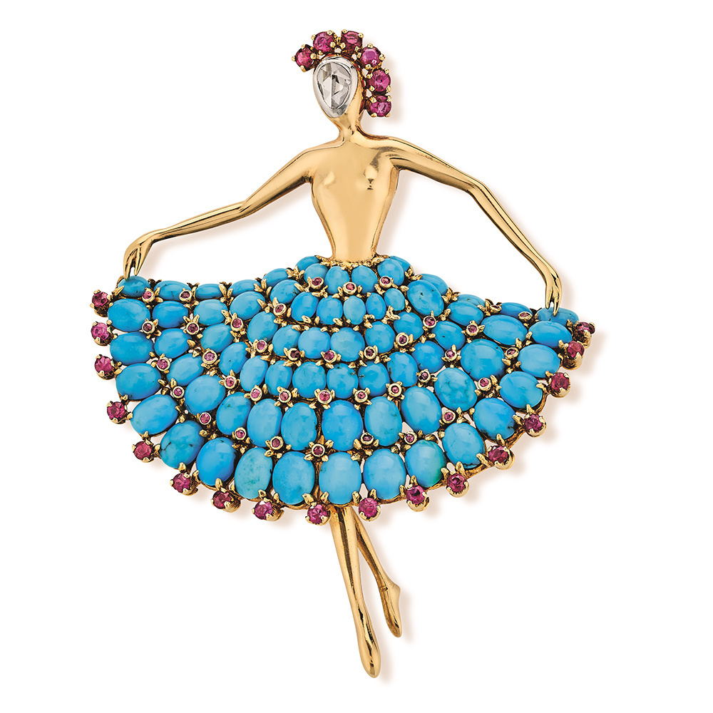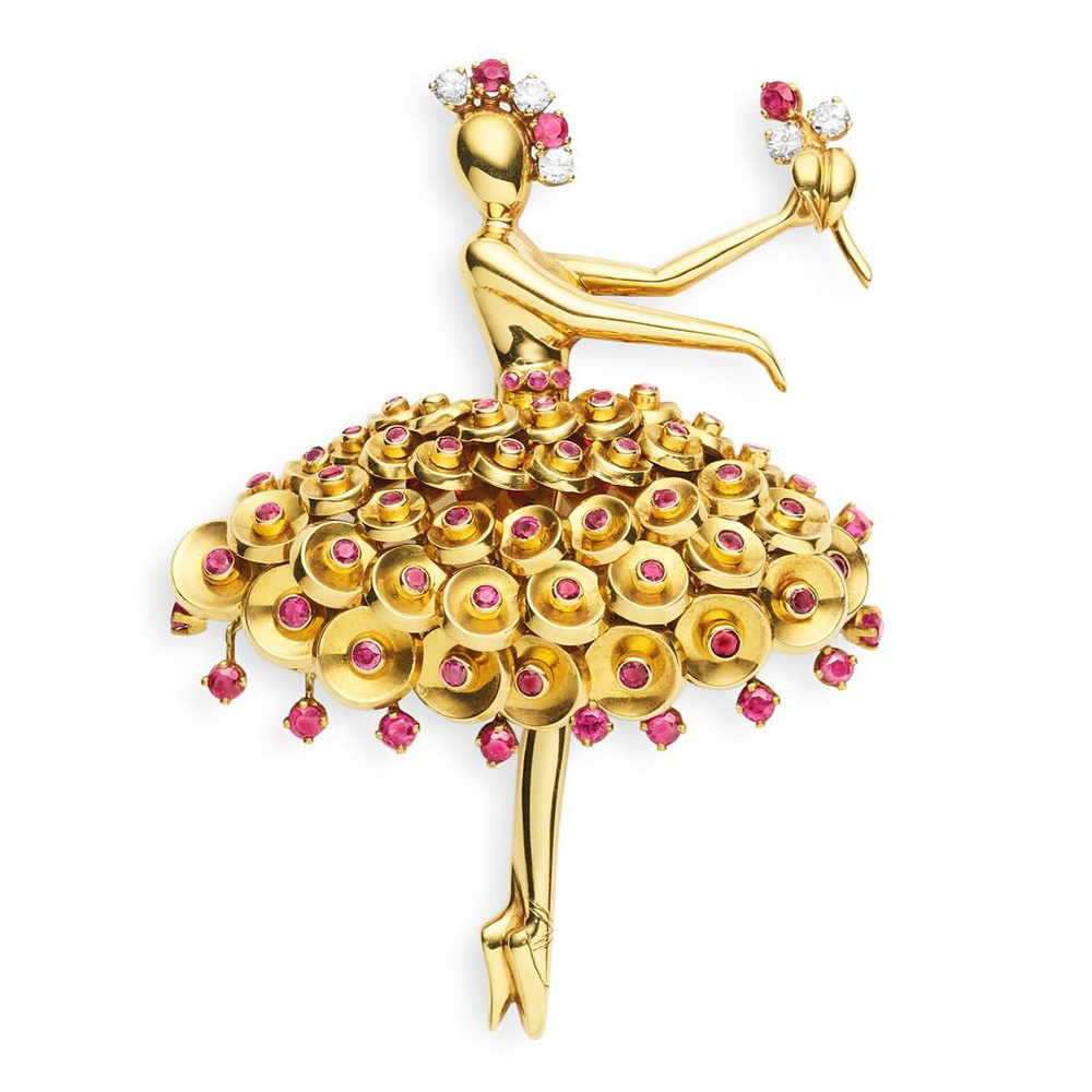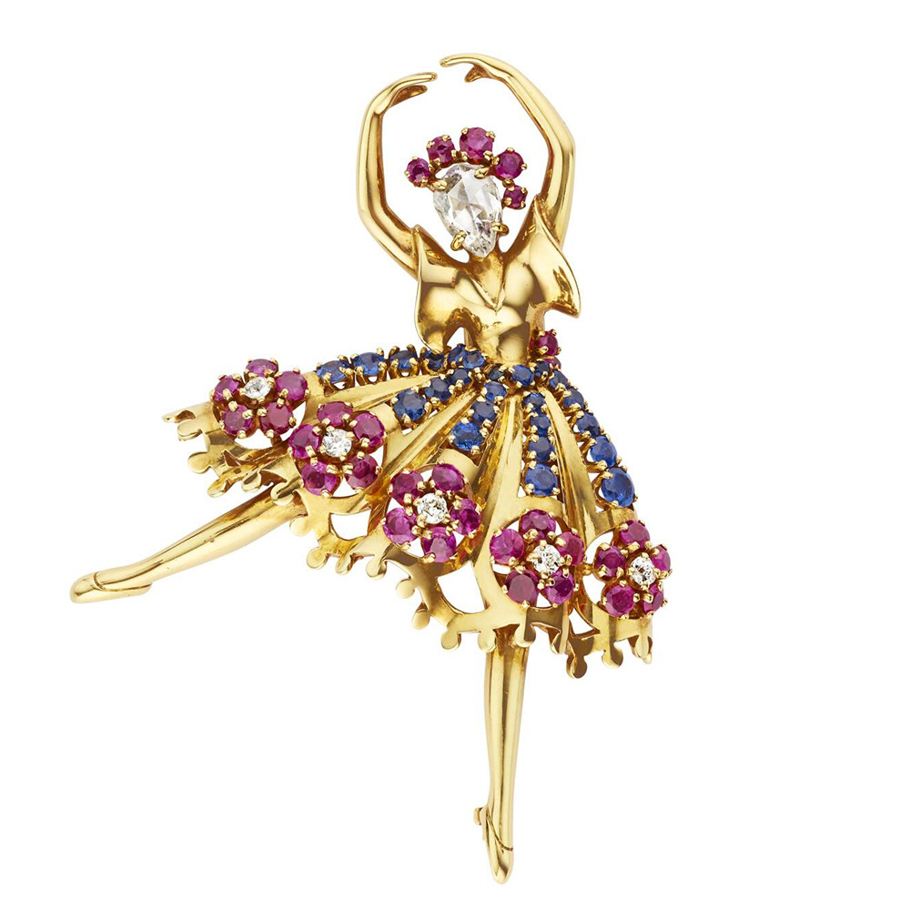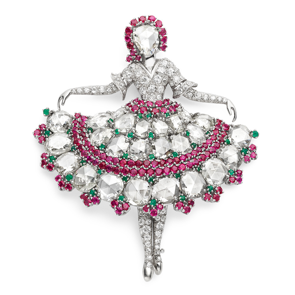 Выставка предлагает детальный обзор классических брошей «Балерина» 1940-х и 1950-х годов, разделённых на две группы согласно материалам и технике исполнения. Первая группа акцентирует блеск алмазной инкрустации: лицо балерины часто украшает грушевидный алмаз огранки «роза», а её изящные руки, ноги и струящаяся пачка мастерски выложены бриллиантами в технике «pavé». Для создания визуальной глубины и контраста детали костюма подчеркиваются цветными драгоценными камнями. Яркий пример — брошь «Танцовщица» 1941 года, где доминируют чистейшие бесцветные бриллианты, а подклад юбки, головной убор и веер расцвечены изумрудами и рубинами, создающими эффектное цветовое напряжение.