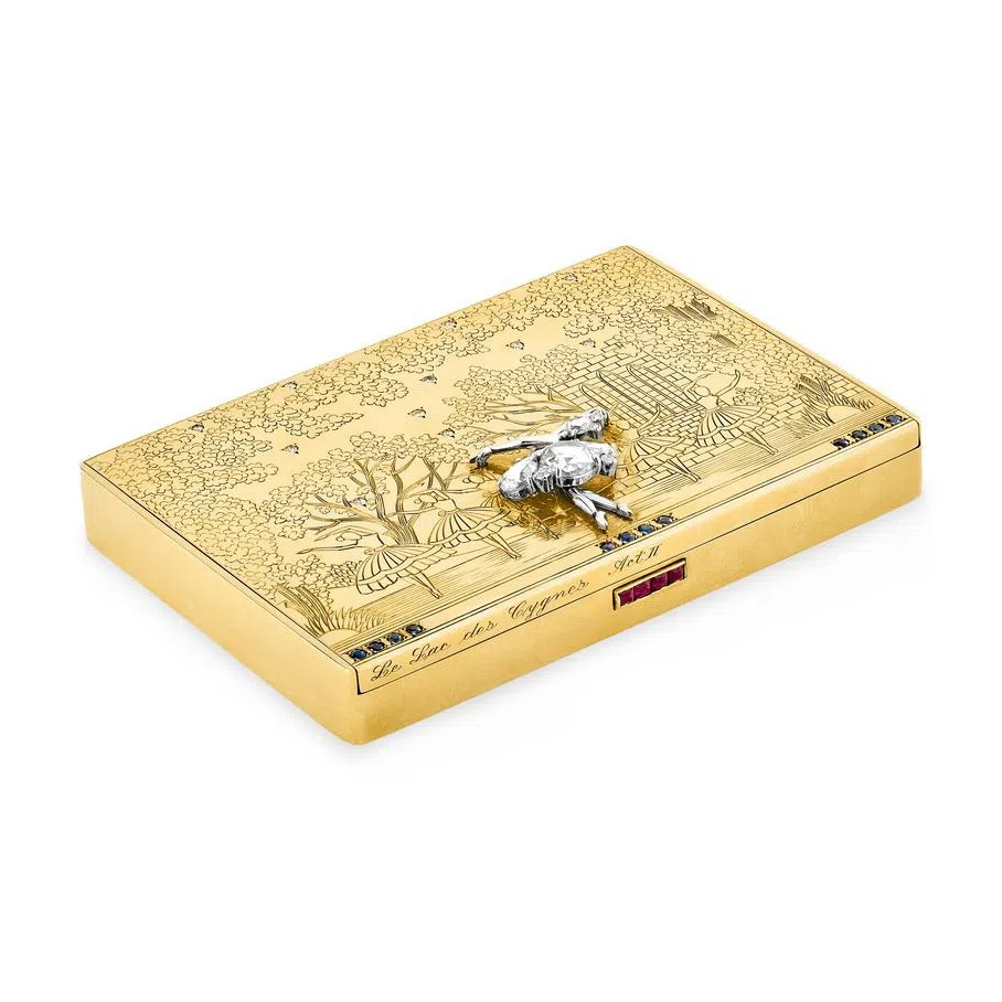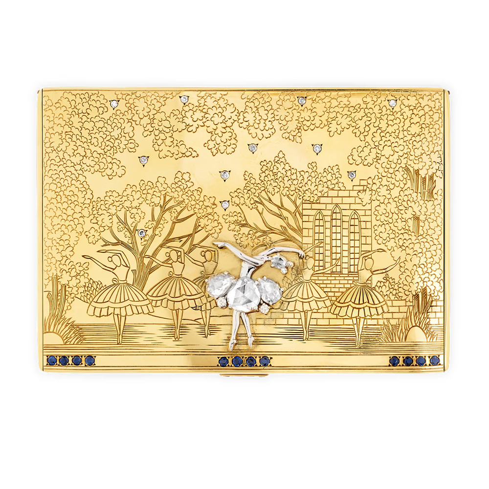 Экспозиция также включает предметы, косвенно отсылающие к балетной эстетике. Среди них — пудреница «Лебединое озеро» 1946 года, созданная по мотивам одноимённого балета П. И. Чайковского. Её золотая поверхность превращена в миниатюрную сцену, обрамляющую фигурку танцовщицы в платиново-бриллиантовом убранстве.