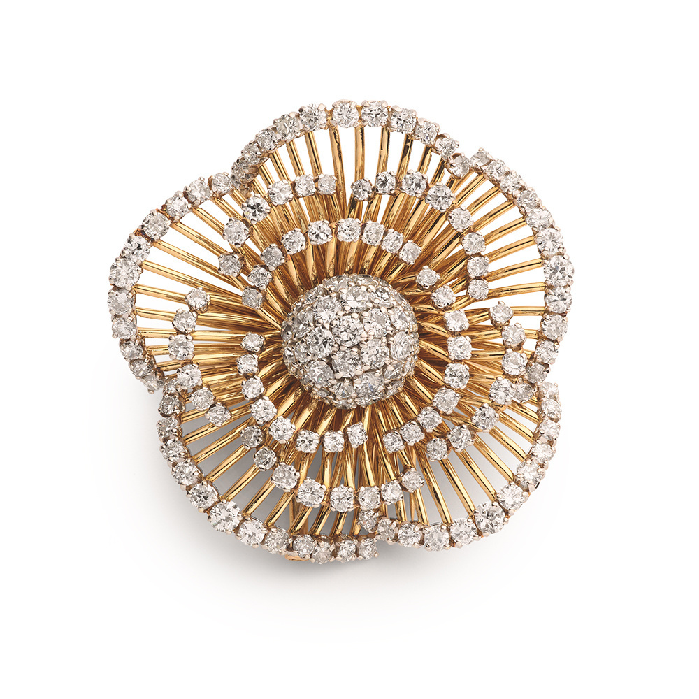 Брошь «Камелия» 1953 года, выполненная из золотой проволоки, формирует ниспадающие лепестки, усыпанные бриллиантами; их плавные изгибы, как отмечают искусствоведы, вызывают прямую ассоциацию с воздушной балетной пачкой.