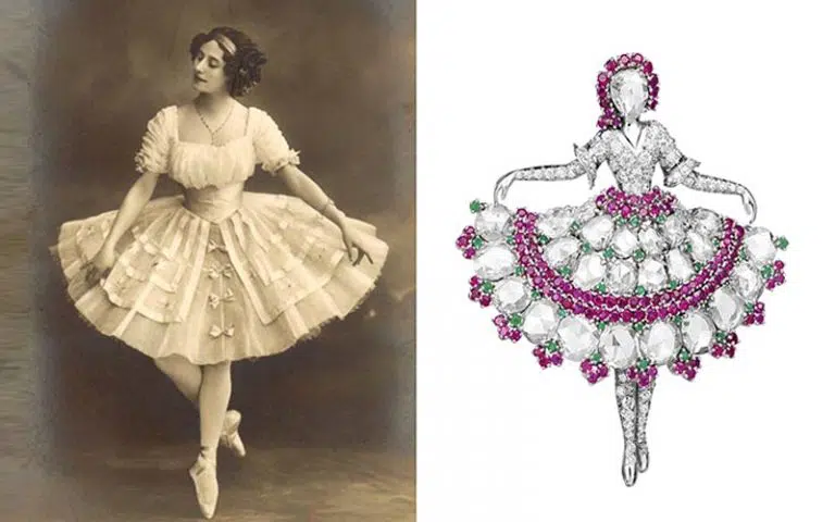 Анна Павлова — выдающаяся русская балерина конца XIX — начала XX веков, прима-балерина Императорского русского балета. Она вошла в историю, в частности, исполнением партии «Умирающего лебедя», которую представила около 4000 раз, и стала первой балериной, предпринявшей мировое турне. Фотографии, запечатлевшие ее реверанс, вдохновили на создание еще одной броши 1940-х годов из платины, бриллиантов, рубинов и изумрудов — на этот раз в честь самой Павловой.