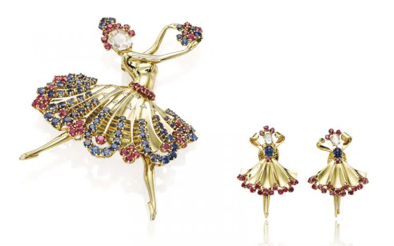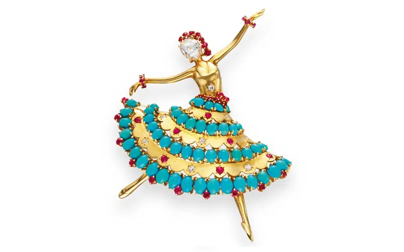 Созданная в 1941 году фигурка «Испанская танцовщица» была одной из первых в исторической балетной серии Van Cleef & Arpels. Она декорирована теми самыми изумрудами, рубинами и бриллиантами, которые позднее Баланчин даст в названия актов своего балета.