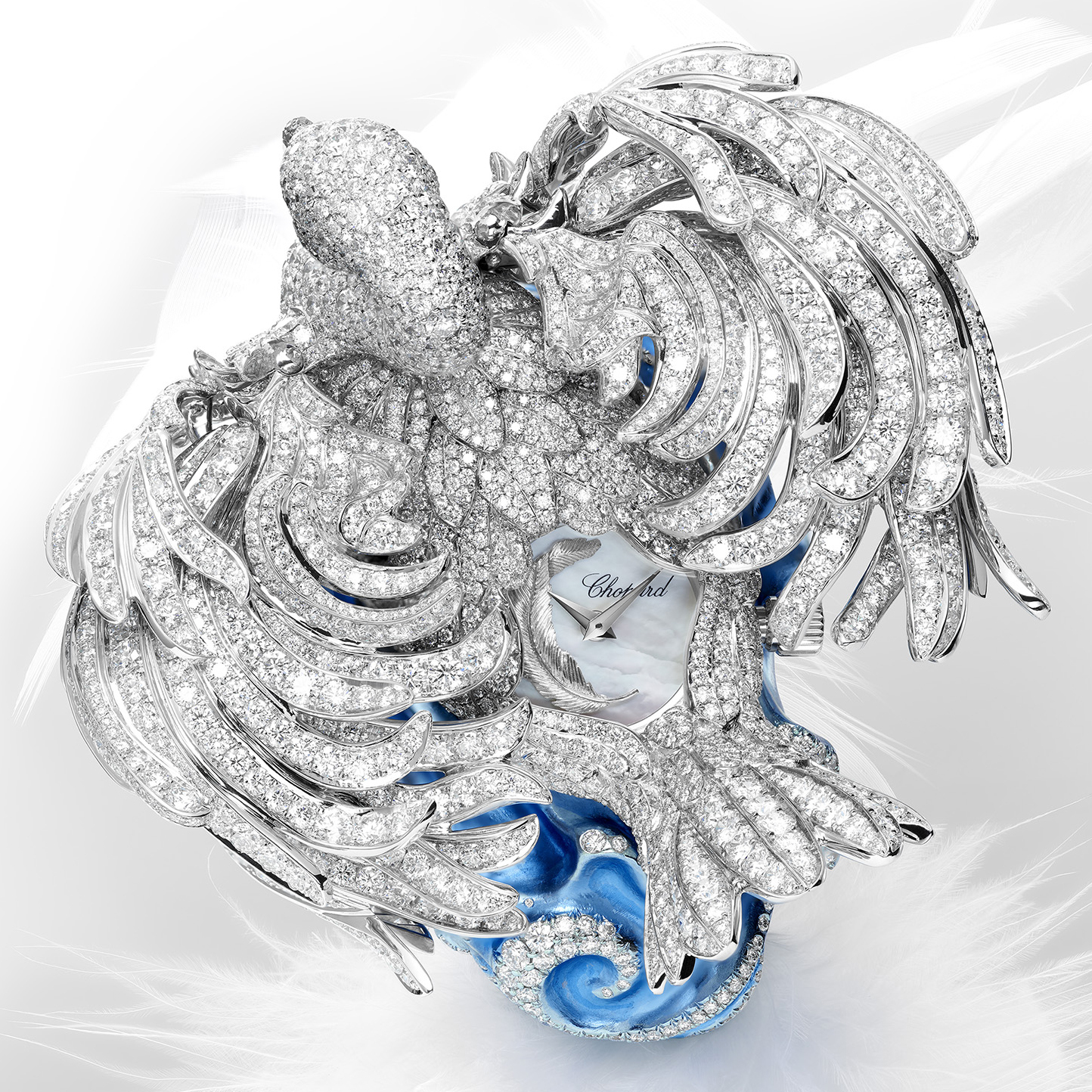 Лебедь покоится на титановой основе, напоминающей морскую пену, деликатно украшенной бриллиантами. Птица крепится к запястью с помощью атласного ремешка, украшенного белыми перьями, и застежки-пряжки в форме пера, выполненной из белого золота. В основе часов лежит чудо мастерства: скрытый циферблат, который открывается только при легком повороте головы лебедя в центральное положение. Это движение запускает внутренний механизм, который активирует раскрытие его крыльев, каждое из которых состоит из трех шарнирных секций, разворачивающихся постепенно. Под этой хореографией скрывается крошечный циферблат из перламутра, украшенный гравированным мотивом пера.