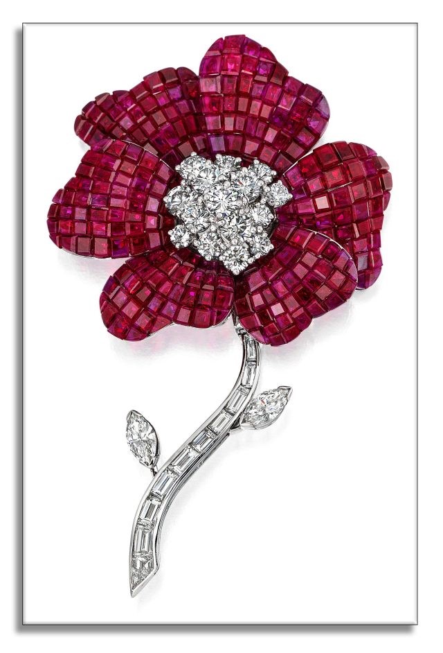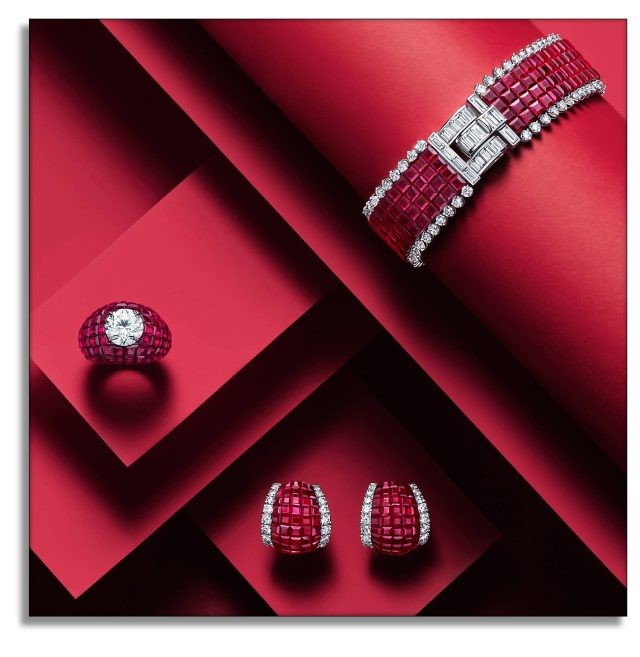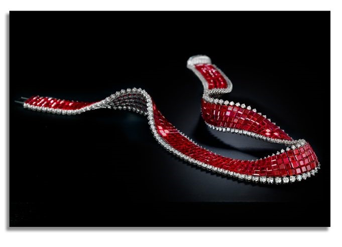 колье с рубинами, закрепленными невидимой закрепкой от Оскара Хеймана. Почти 500 квадратных рубинов были индивидуально закреплены и инкрустированы круглыми бриллиантами общим весом более 17 карат. Фирменная застежка украшена 10 бриллиантами багетной огранки.