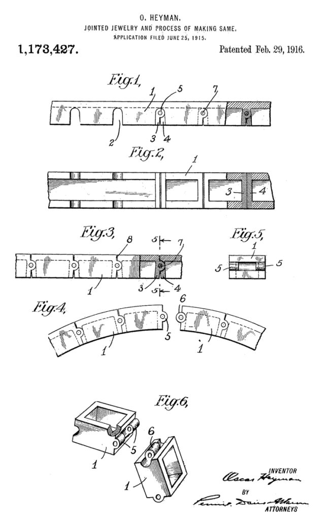 В 1916 году Оскару Хейману выдан первый из шести патентов, связанных с технологиями изготовления ювелирных изделий. В нем описывается процесс создания украшений, состоящих из мелких деталей, соединенных между собой шарнирным механизмом, обеспечивающим гибкость изделия. Патент был выдан 29 февраля, в високосный день!