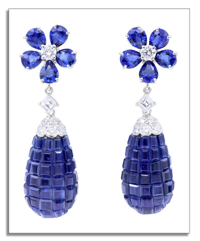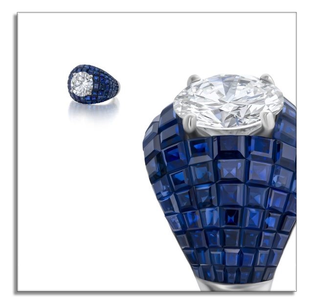 Камни ограняются по отдельности, часто переограняются для большей точности, и располагаются в нужном порядке; в результате получается цельная мозаика со скульптурной и объемной привлекательностью. Здесь бриллиант круглой огранки VS1 весом 5,15 карата окружен 110 квадратными сапфирами, закрепленными невидимым способом.