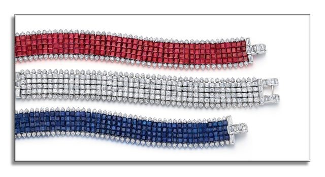 три классических браслета Oscar Heyman с невидимой закрепкой: рубины, бриллианты и сапфиры. На изготовление каждого браслета уходит приблизительно 650 часов.
