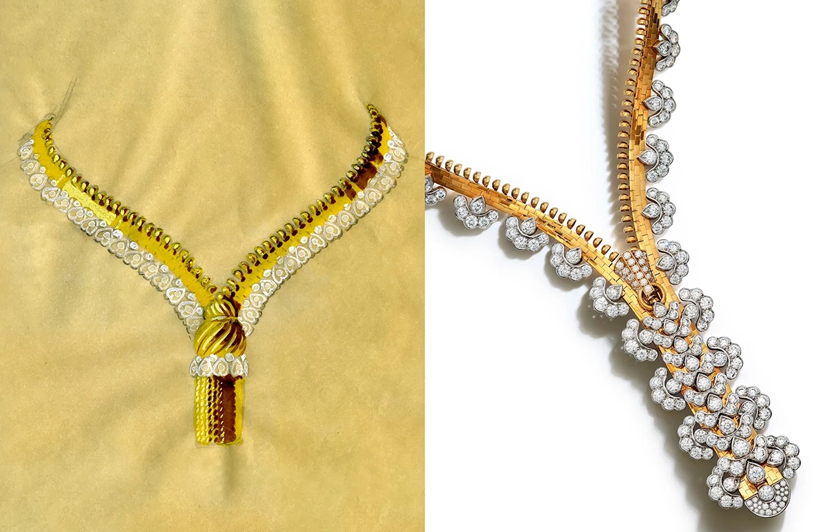 Слева: дизайн первого колье Zip, созданного в 1950 году, из архивов Van Cleef & Arpels. (Предоставлено Van Cleef & Arpels)