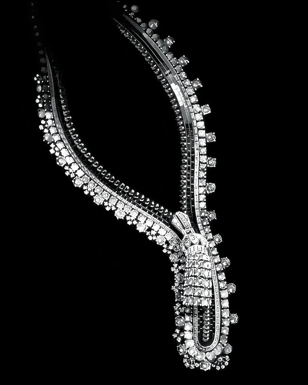 Представленное в середине XX века, колье Zip не имело аналогов. Сохраняя полную функциональность, оно изящно расстегивалось и застегивалось, подобно своей промышленной предшественнице, при этом сверкая ограненными бриллиантами и драгоценными камнями. Результатом стало слияние высокой моды, инженерной мысли и виртуозного мастерства, превратившее простое изобретение в одну из самых знаковых работ в истории ювелирного дела. Оно было воспринято как радикальное и одновременно завораживающее.