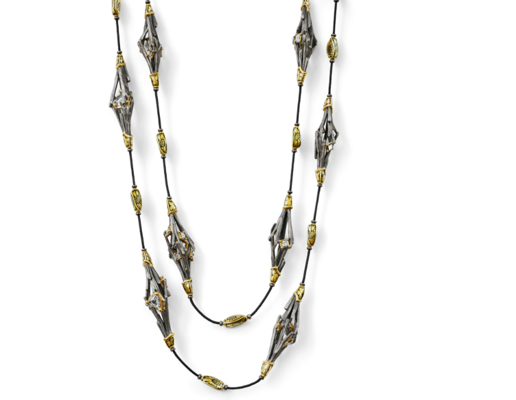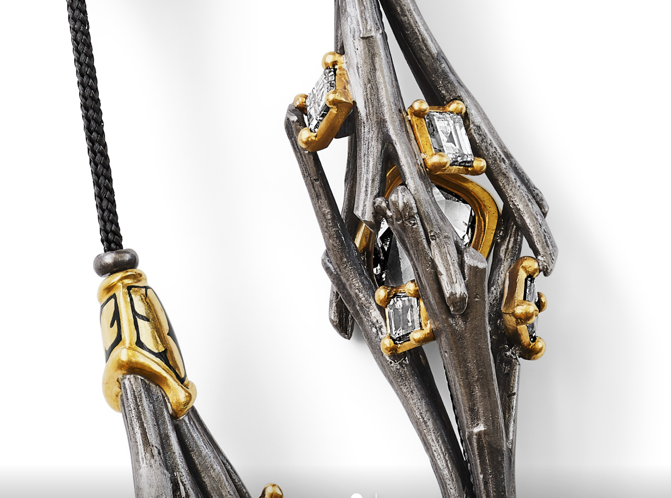 Ожерелья «Hemerocallis» В этой паре ожерелий бриллианты огранки «карре» и старинные индийские алмазы огранки «полки» — традиционной могольской формы с малым количеством граней, повторяющих контуры исходного кристалла — заключены в воздушные, ромбоэдрические гнёзда.