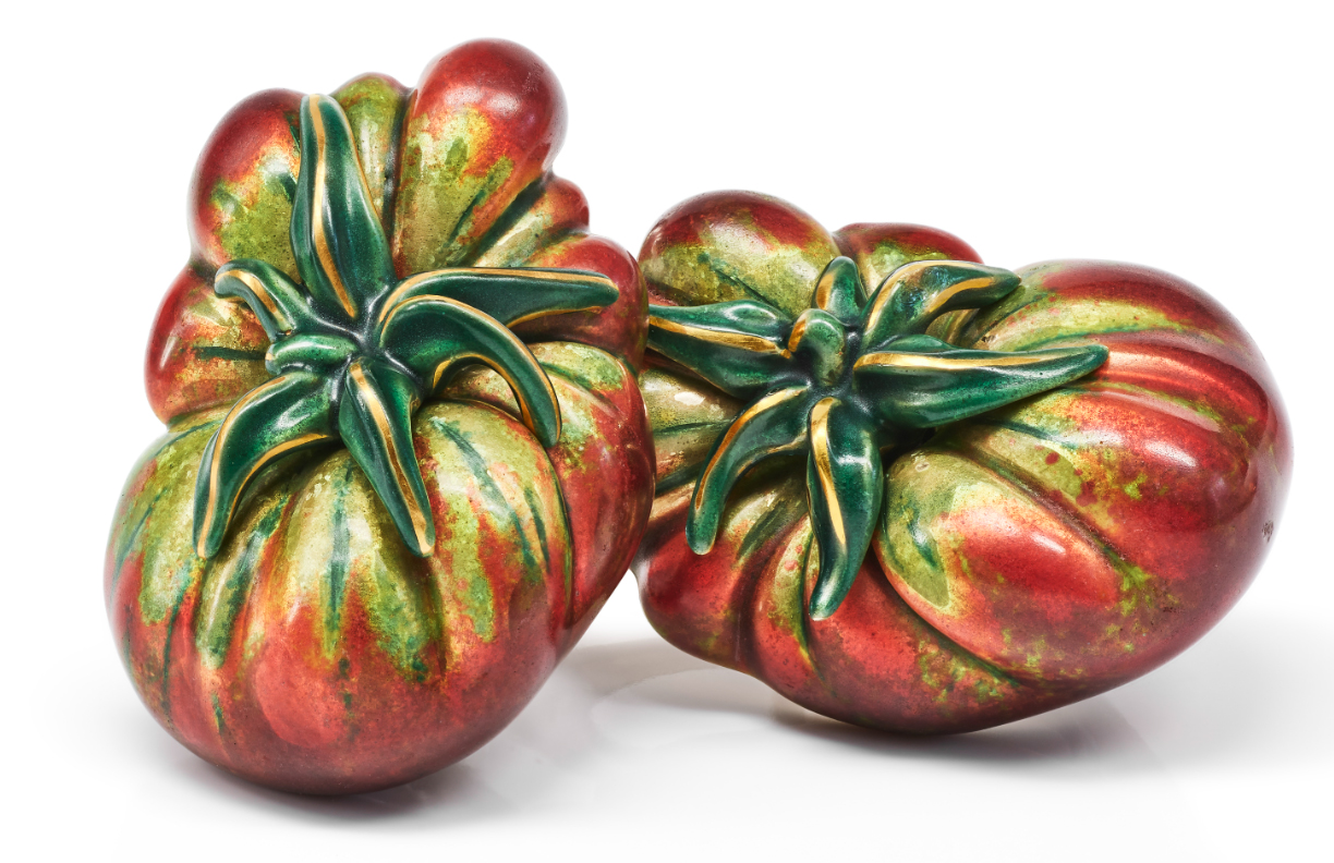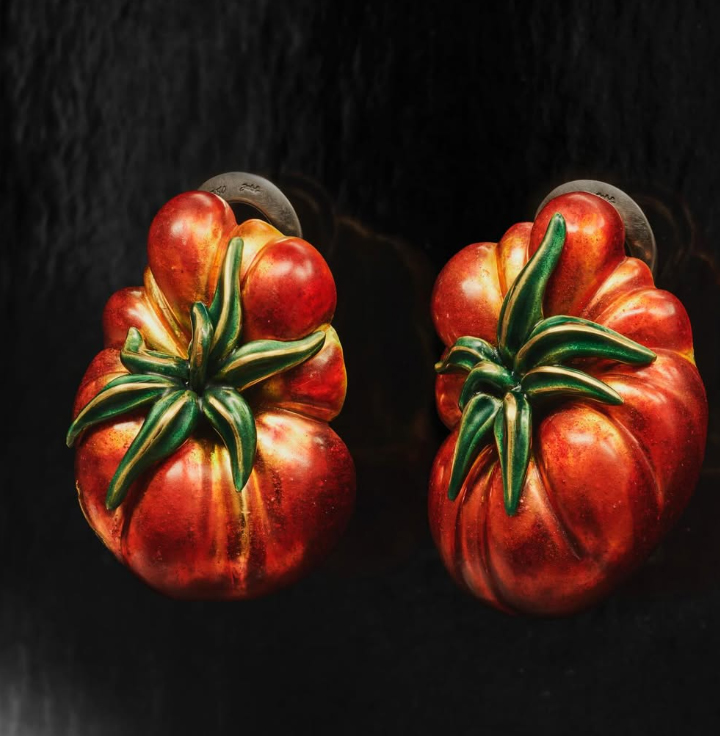 Серьги «Pomodoro». Пара этих серёг воплощает образ спелых, только что собранных с грядки томатов — ярких, сочных, полных жизни. Они являются буквальной интерпретацией итальянского термина pomo d’oro («золотое яблоко»). Ярко отполированное жёлтое золото просвечивает сквозь слои красной и зелёной стекловидной эмали, а характерная ребристая структура плода подчёркнута тонкими линиями тёмно-зелёной эмали. В центре каждого «помидора» выгравированная чашечка в форме звезды также заполнена тёмно-зелёной эмалью.