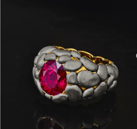 В этом кольце эту природную модель воспроизводят «валуны» из белого золота неправильной формы, между которыми «застревает» мелкое зернистое золото. В эпицентре этой композиции находится главная находка — сам рубин.
