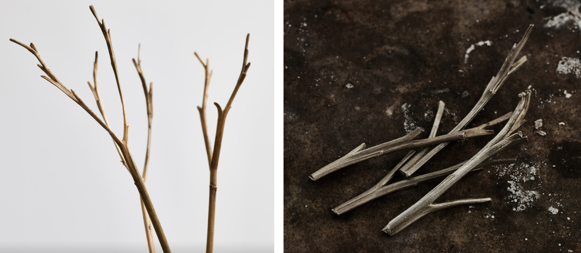 Гнёзда расположены асимметрично и нерегулярно, что позволяет носить ожерелья различными способами, в том числе соединяя их в одну протяжённую нить. В данной работе Отто Якоб исследует технику литья с натуры (nature casting) — древний метод, встречающийся в этрусских и эллинистических украшениях и возрождённый в Европе XVI века, наиболее известным адептом которого был Венцель Ямнитцер (1508–1585). Суть метода заключается в использовании натурального ботанического или органического образца для создания литейной формы. В процессе отливки исходный объект выжигается, оставляя пустотелое пространство, в точности повторяющее его форму и текстуру. При заполнении этого пространства расплавленным золотом получается абсолютно точная металлическая копия, сохраняющая мельчайшие детали поверхности оригинала.