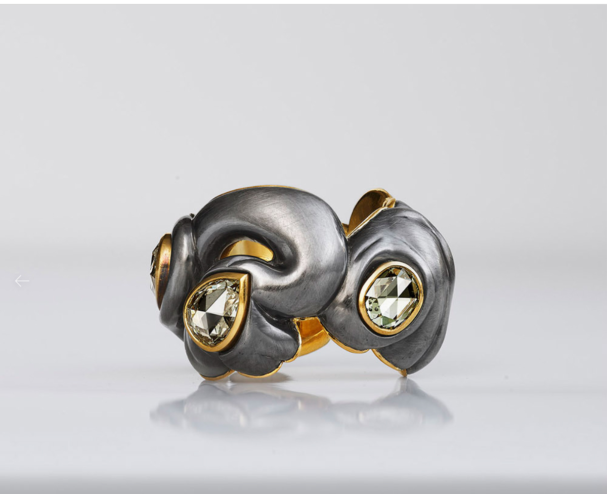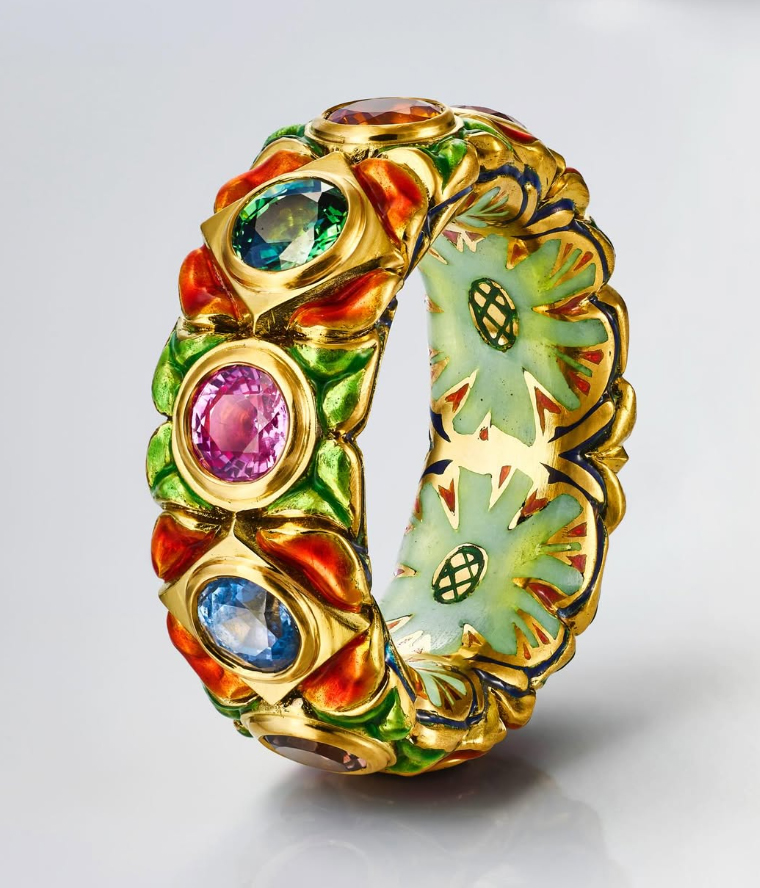 Кольцо, созданное в 2003 г., вдохновлено эмалью европейского Возрождения и индийскими украшениями махараджей. Кольцо выполнено из 18-каратного желтого золота и инкрустировано ярко окрашенными сапфирами, расположенными в чередующихся круглых и квадратных оправах.