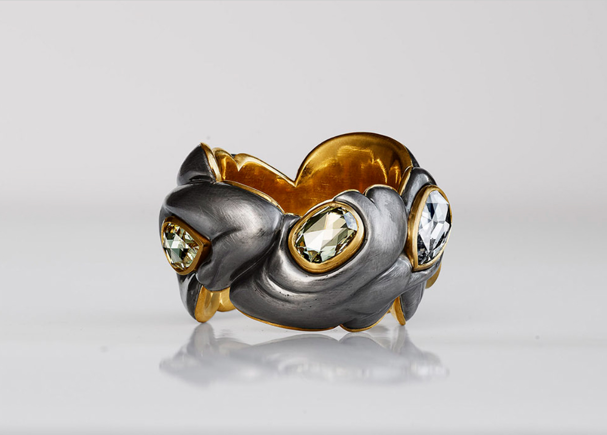 Одна из наиболее эффектных работ, подготовленных Якобом для TEFAF Maastricht в этом году, — кольцо с исключительно ярким бирманским рубином цвета «голубиной крови». Его конструкция основана на простом геологическом наблюдении за формированием россыпных месторождений золота: в потоке тяжёлые частицы металла осаждаются там, где течение прерывается — за камнями или в трещинах под ними, — в то время как более лёгкий песок продолжает движение.