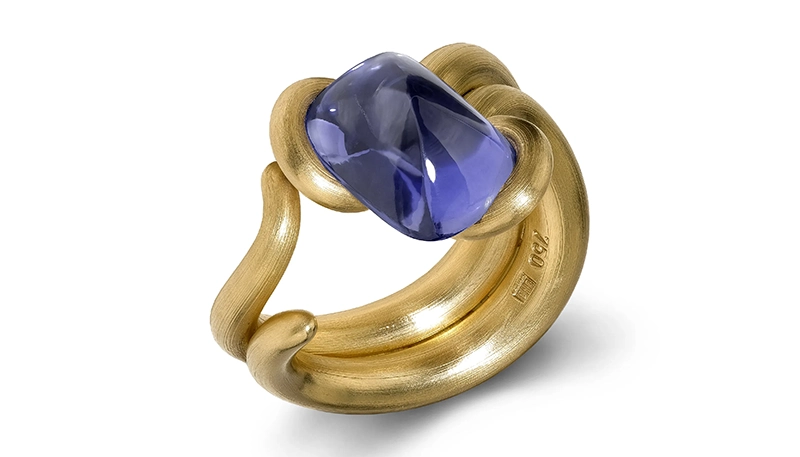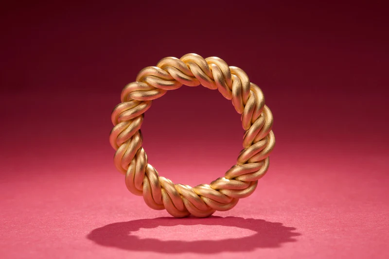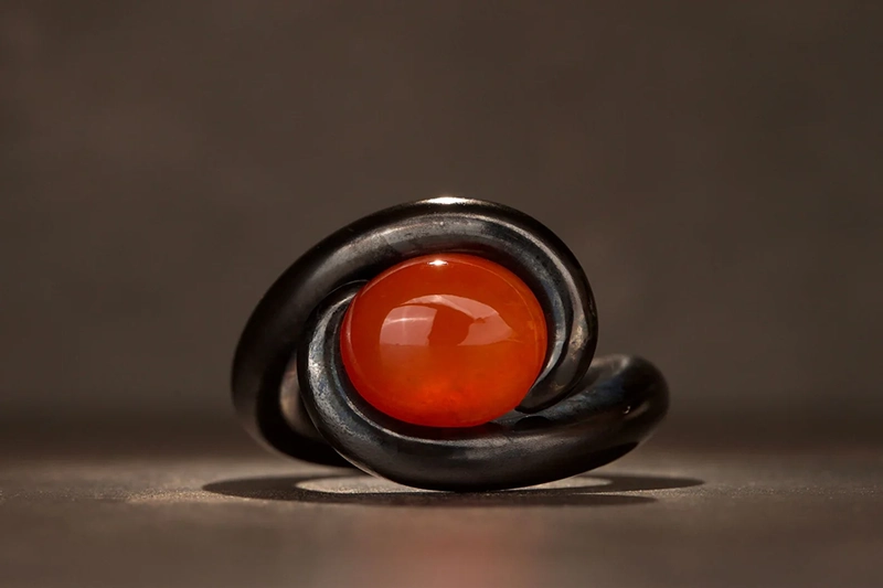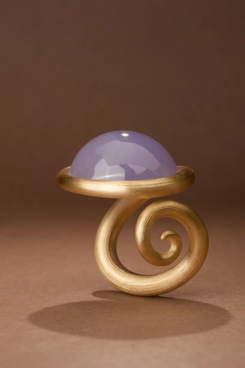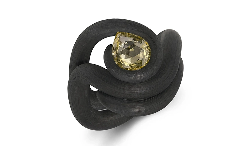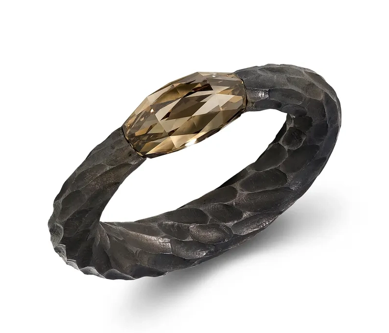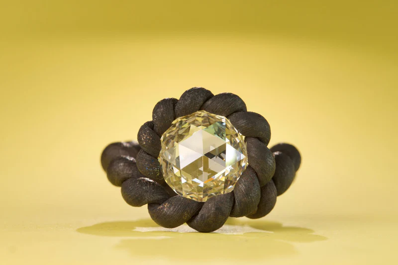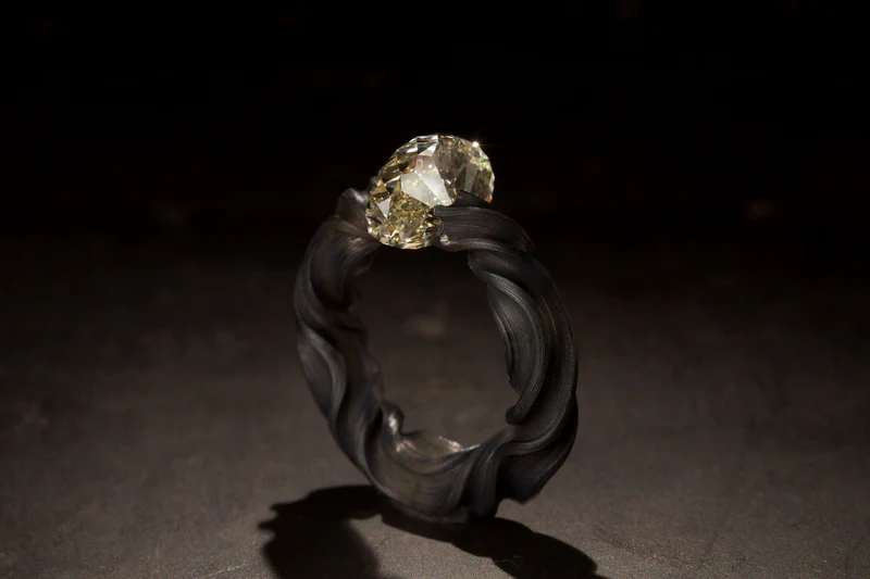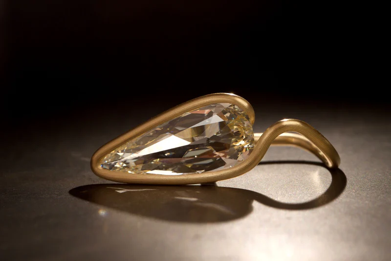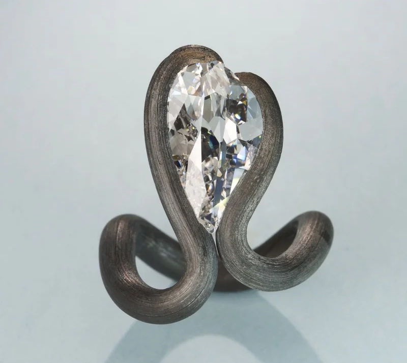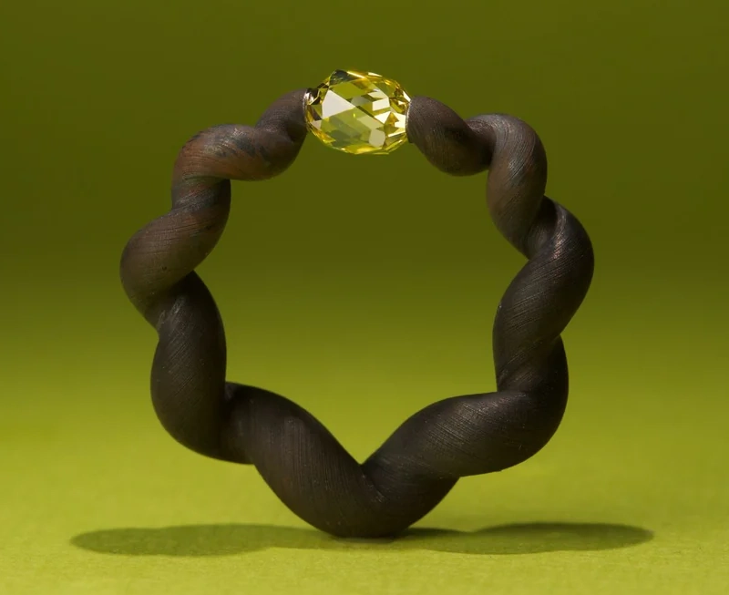 Его фирменная техника закрепления камней посредством натяжения — при которой бриллианты интегрируются в процессе формовки металла, а не после неё — стала краеугольным камнем художественного стиля. Без традиционных крапанов или зажимов камни воспринимаются подвешенными силой самого металла, удерживаемыми в состоянии элегантного металлургического напряжения. Достижение этого баланса требует исключительной предусмотрительности: камень часто занимает своё положение до того, как кольцо обретает окончательную форму, вынуждая художника с математической точностью прогнозировать каждый последующий шаг. Натяжение должно быть достаточным для безопасной фиксации, не создавая уязвимых точек, а плавность линий должна сохранять гармоничность со всех ракурсов.