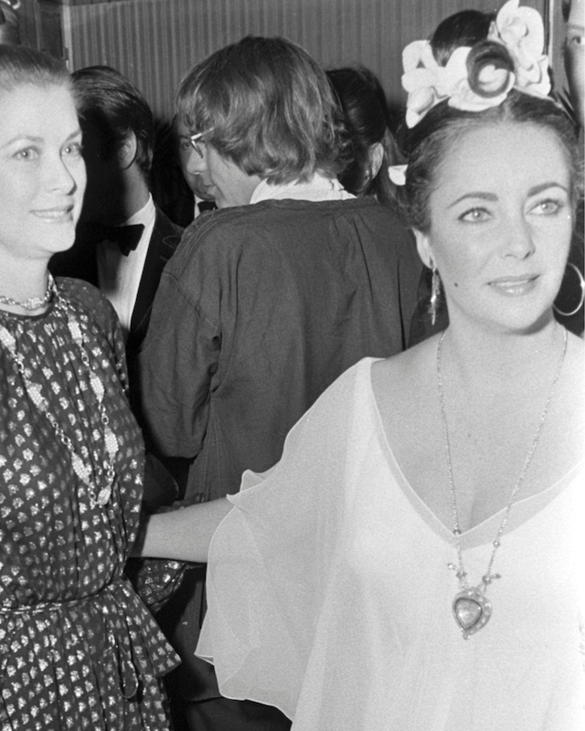 Грейс Келли и Элизабет Тейлор присутствуют на вечеринке во время празднования 40-летия Тейлор в Будапеште, Венгрия, 26-27 февраля 1972 года. На фотографии Тейлор в бриллианте «Тадж-Махал». (Getty Images)