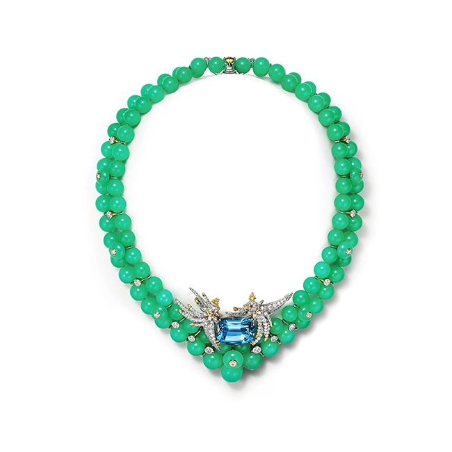 Один из самых впечатляющих комплектов украшений представляет собой колье с двумя птицами, сидящими на великолепных аквамаринах Санта-Мария огранки «подушка» из Бразилии. Насыщенный синий цвет камней контрастирует с двумя нитями бусин из хризопраза, их округлые формы и яблочно-зеленый оттенок излучают поразительную свежесть. Колье трансформируемое: центральный мотив предназначен для ношения в качестве броши.