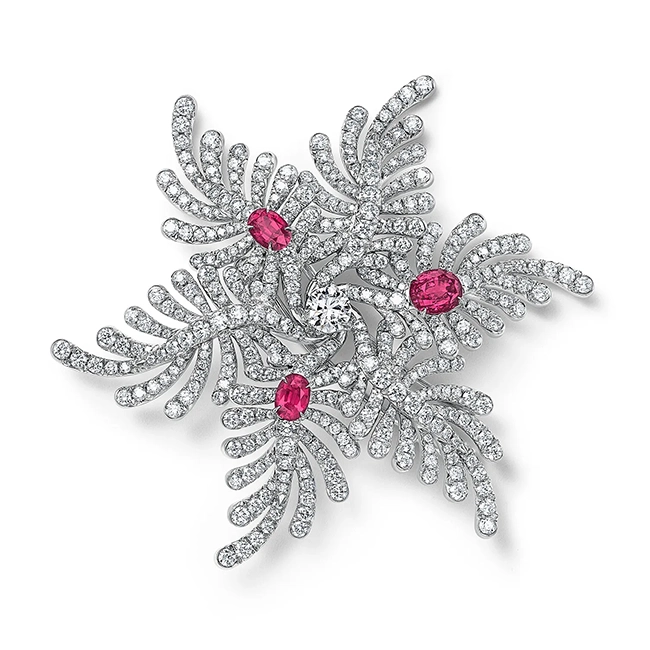 Новые броши из коллекции «Птица на скале», тем временем, приобретают отчетливо тропический характер: три райские птицы расположены на вершине барочного мексиканского огненного опала, ярко-розового бразильского рубеллита и оранжевого спессартина.