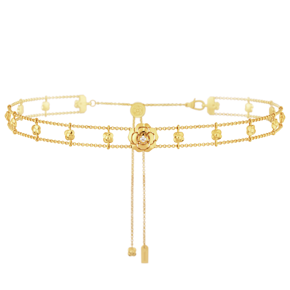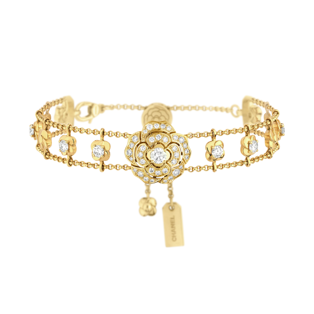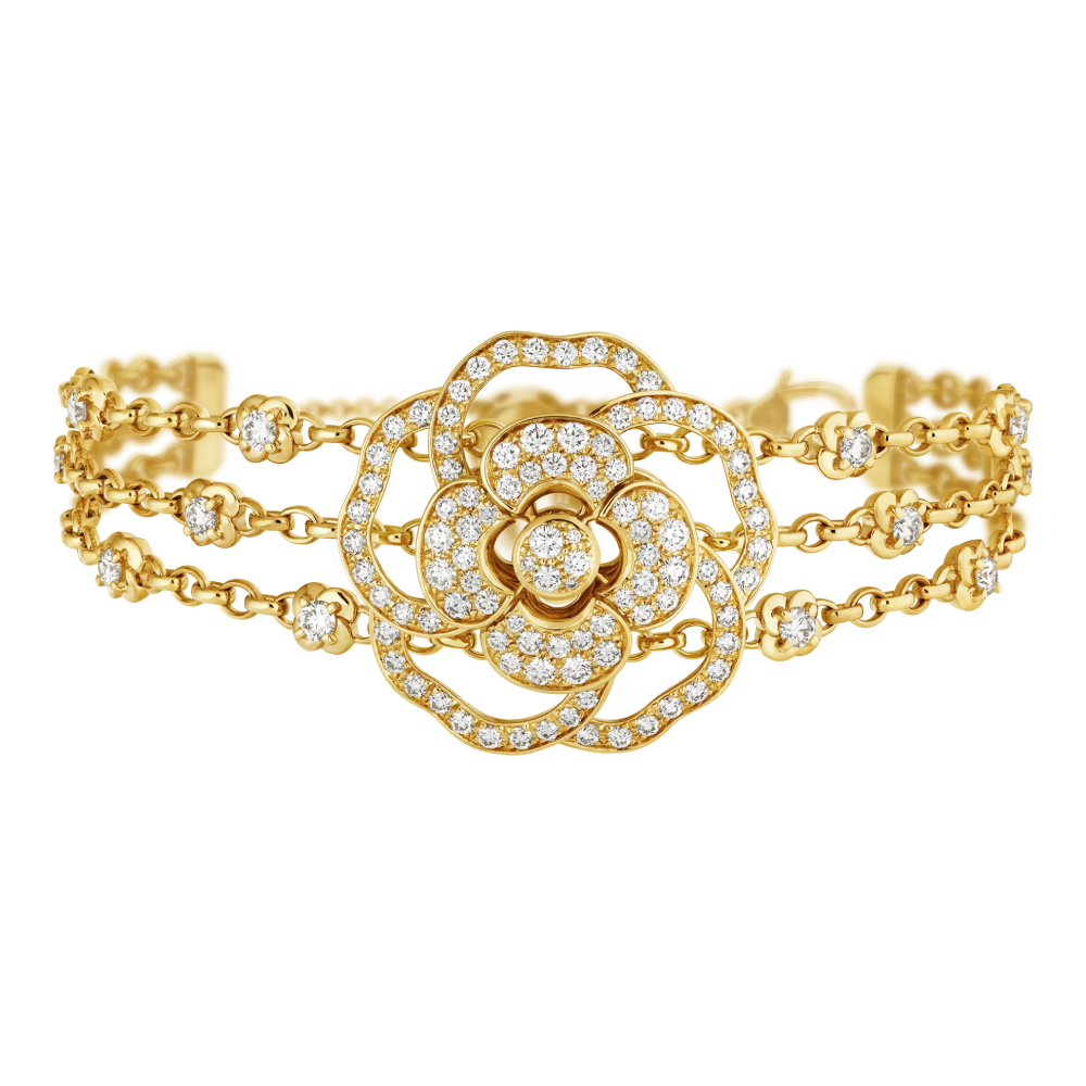 Браслет из трех цепочек, соединенных звеньями в форме бриллиантовых бутонов, элегантно обвивает запястье. Центральным элементом является камелия, контур которой инкрустирован бриллиантами. Ажурная структура создает воздушный и прозрачный эффект. Браслет доступен в вариантах из красного, желтого и белого золота.