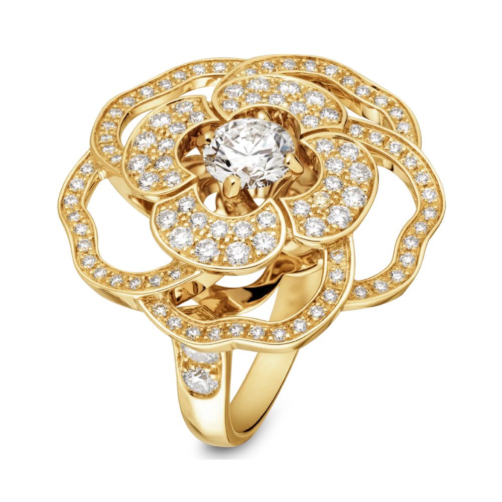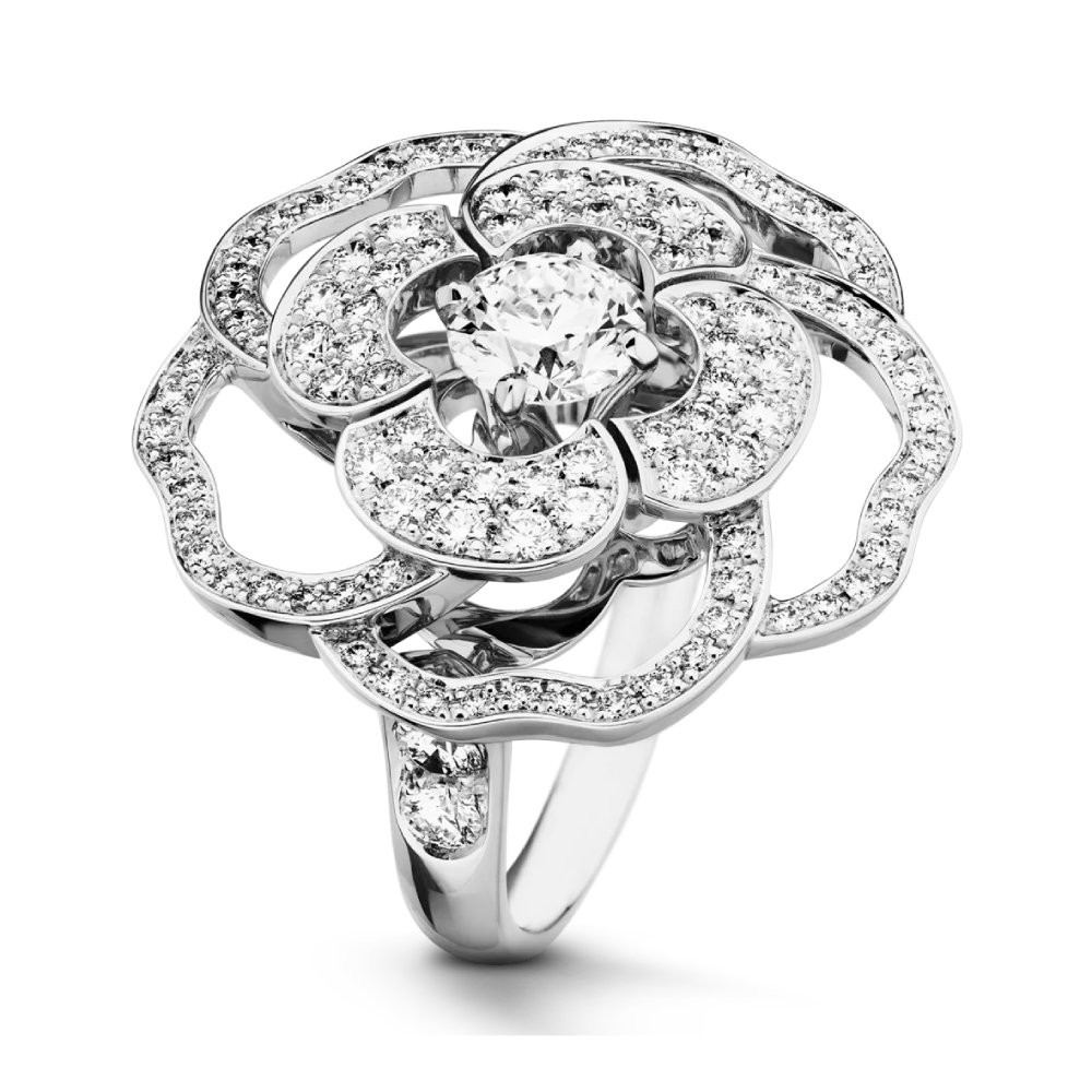 Кольцо воссоздает камелию в момент расцвета. Первый слой лепестков щедро усыпан бриллиантами, чье сияние подчеркивает расположенные в центре тычинки из бриллиантов круглой огранки общим весом 0,7 карата. Второй слой лепестков, очерченный бриллиантами из драгоценного металла, создает эффектную игру объемов и текстур, характерную для ювелирных изделий Дома Chanel. Это художественное выражение, сочетающее иллюзию и реальность, является отличительной чертой коллекции «Camélia».