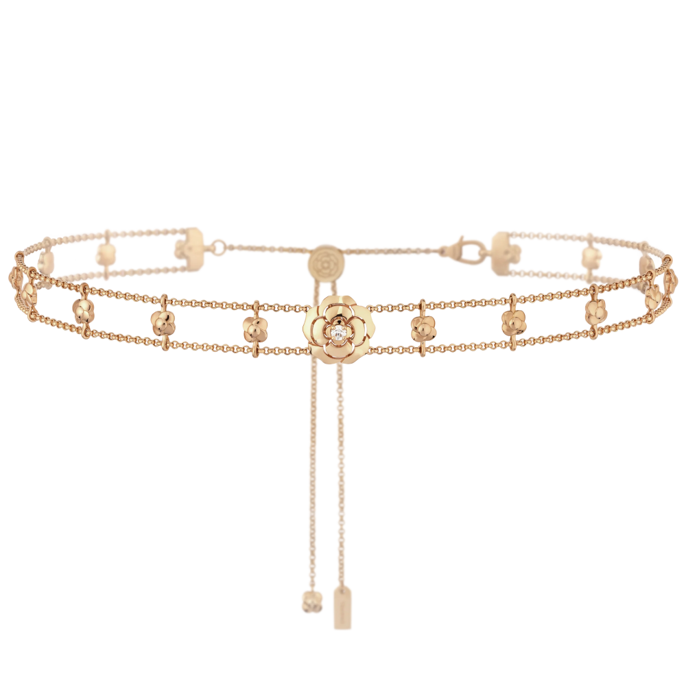 Коллекция включает три эксклюзивных изделия. Колье, выполненное в виде двойной цепочки, украшено бутонами из драгоценного металла, словно невесомо парящими у основания шеи. В центре композиции – распустившаяся камелия с зеркально отполированными лепестками, играющими светом и тенью и подчеркивающими сияние бриллиантов круглой огранки, расположенных в центре цветка. Колье представлено в версиях из желтого и розового золота, что соответствует традициям ювелирного Дома Chanel.