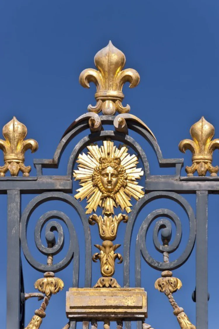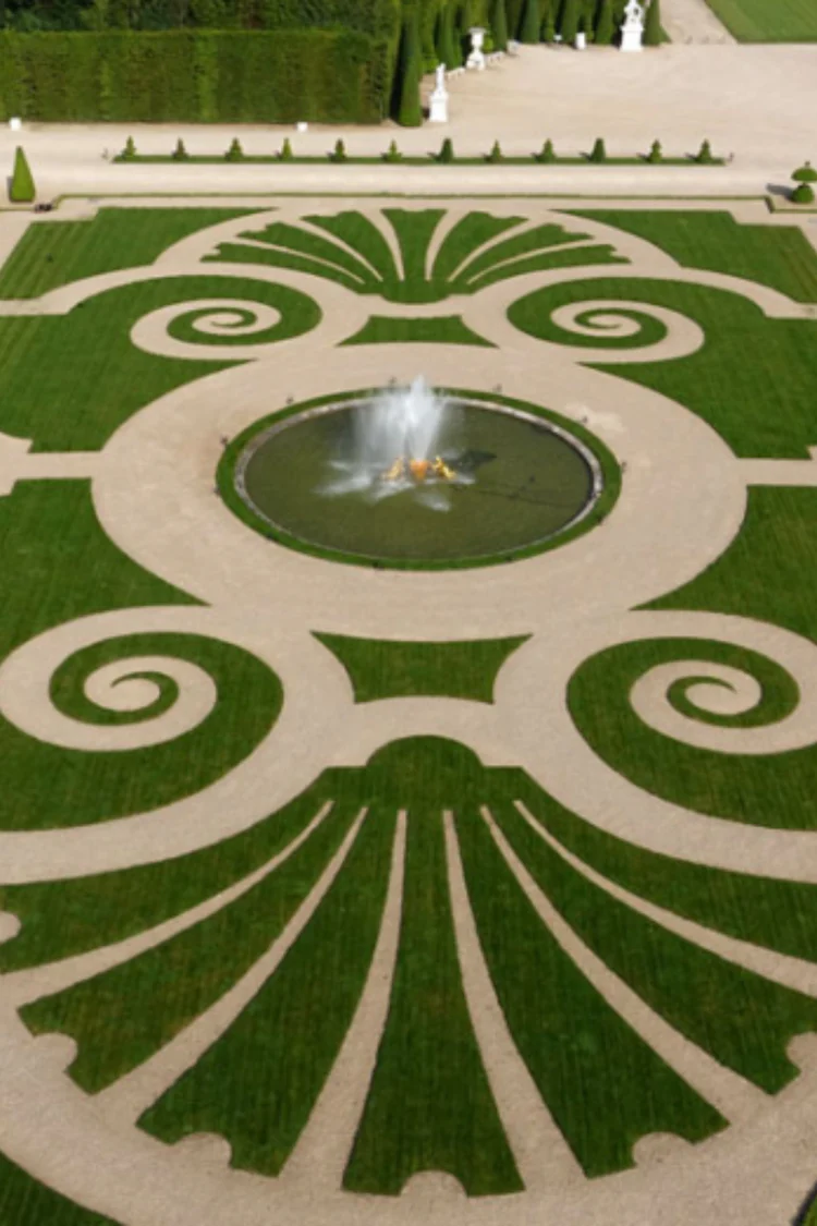 Французские сады с их коваными воротами послужили мне основой для мотивов тромплея . Узоры клумб и спиралей из кованого железа вдохновили меня на создание воздушной конструкции из посеребренных полос, украшенных золотом и бриллиантами.