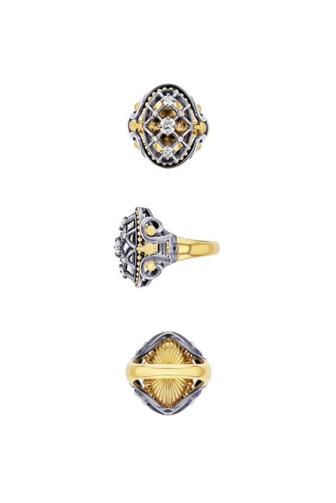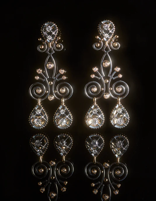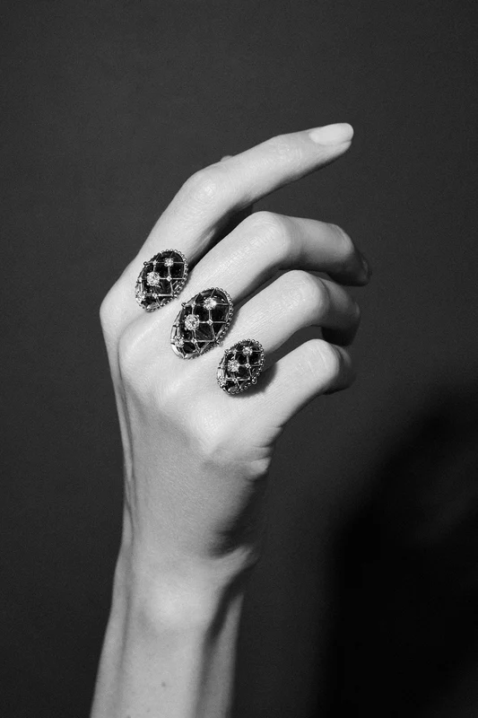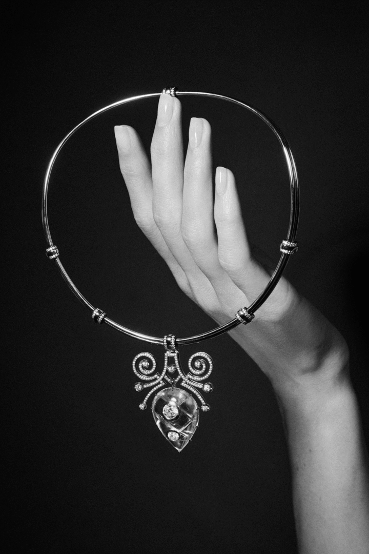 Из этого менуэта света и золота я создал оправы для своих вечных бриллиантов. Расположенные поверх сетки из состаренного серебра с бриллиантами, обрамляющей вогнутое золотое зеркало или усеивающей горный хрусталь, они парят в игре отражений.