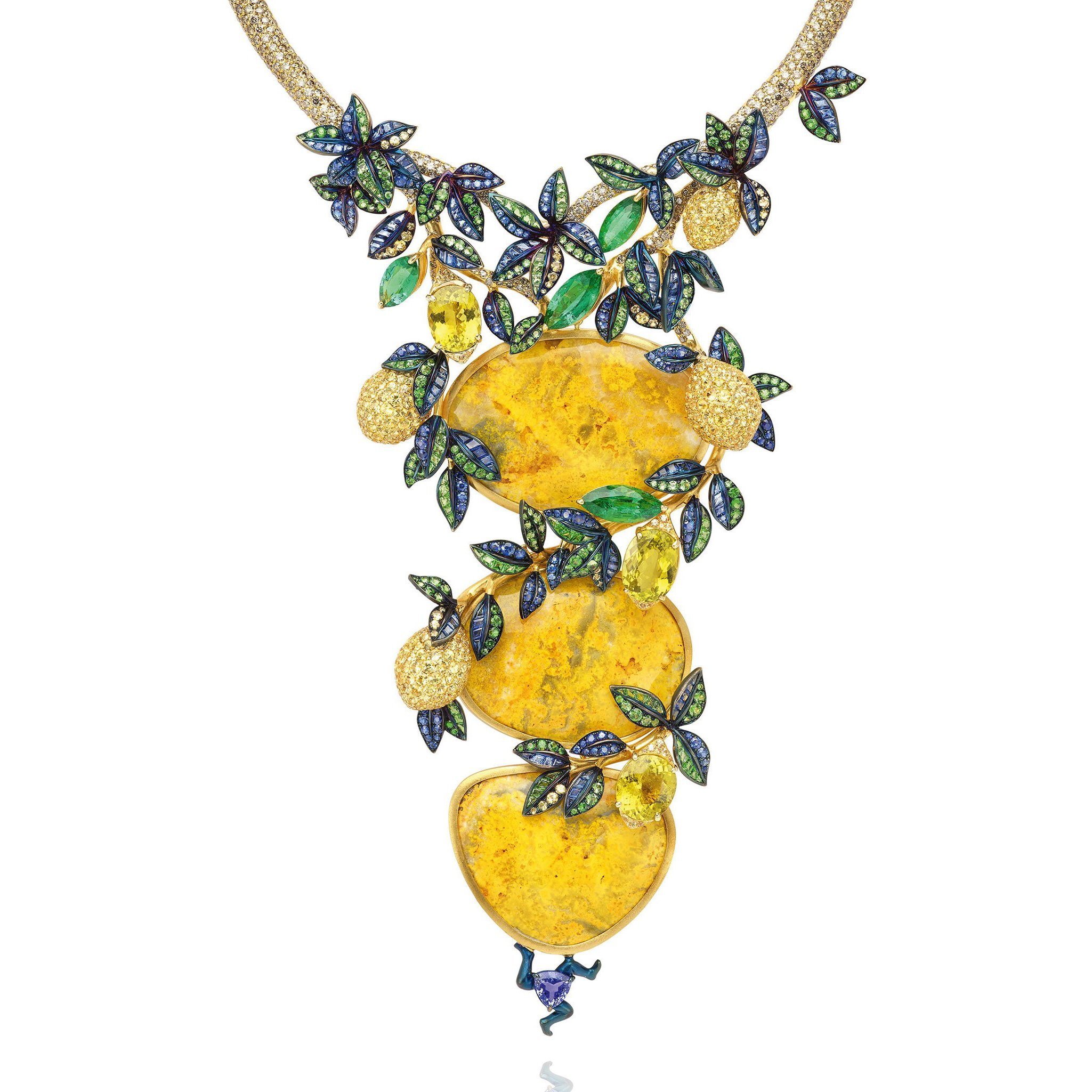 Колье Orchard of Sicily из желтого золота от Lydia Courteille с яшмой, изумрудом, турмалином, танзанитом, цаворитом, сапфиром и коричневыми бриллиантами.