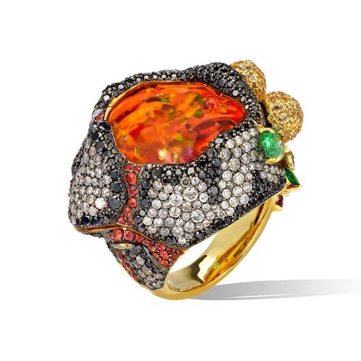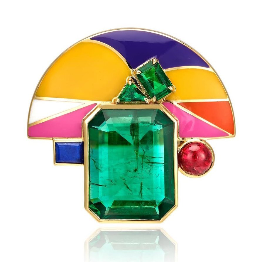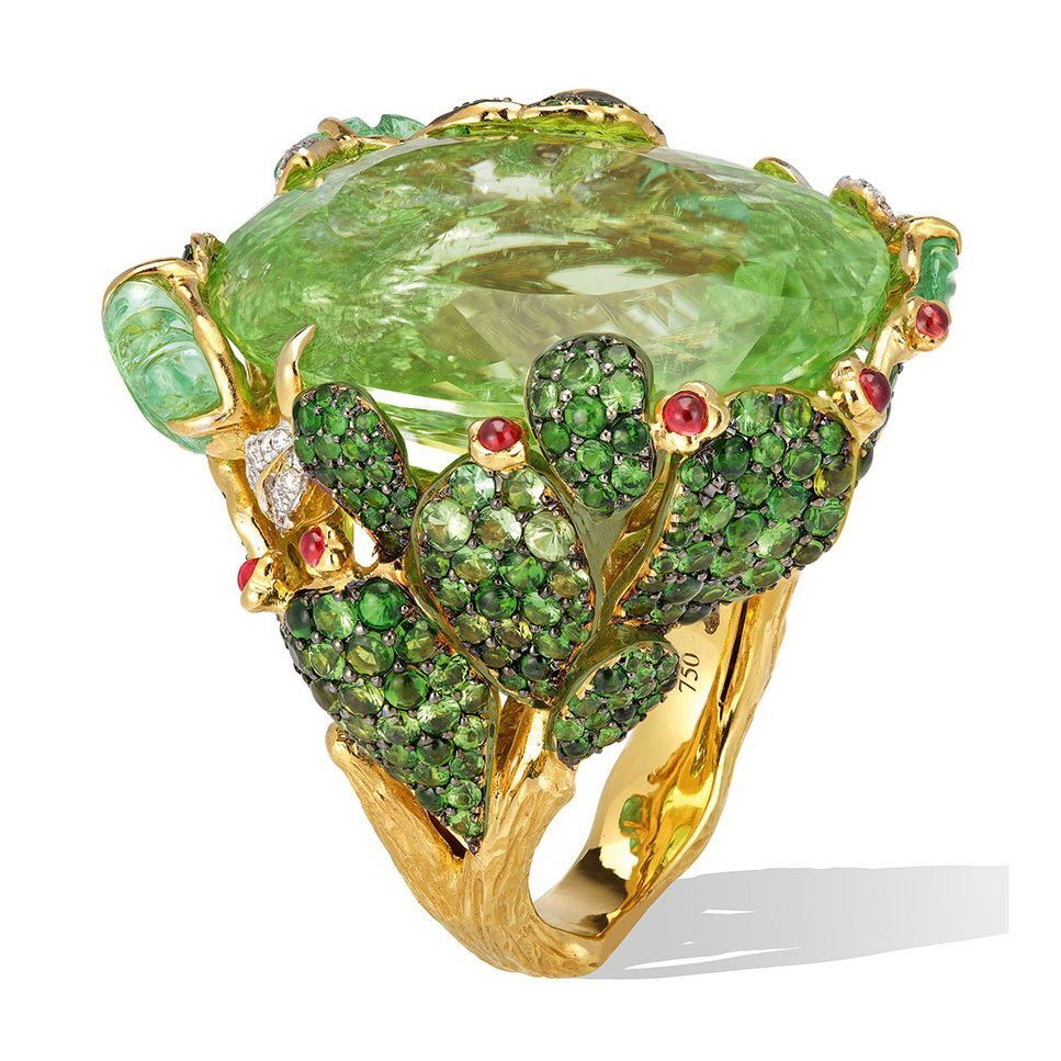 Центральным камнем является зеленый турмалин параиба весом 43,17 карата с изумрудами, цаворитами, желтыми и оранжевыми сапфирами и бриллиантами.