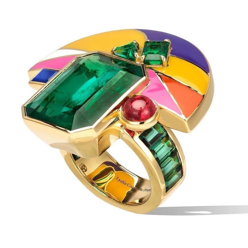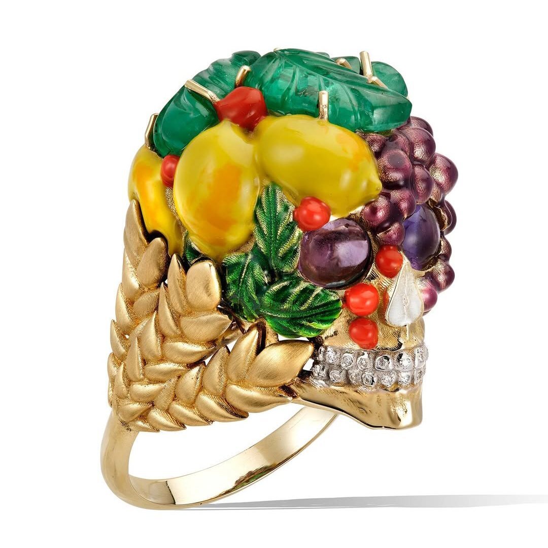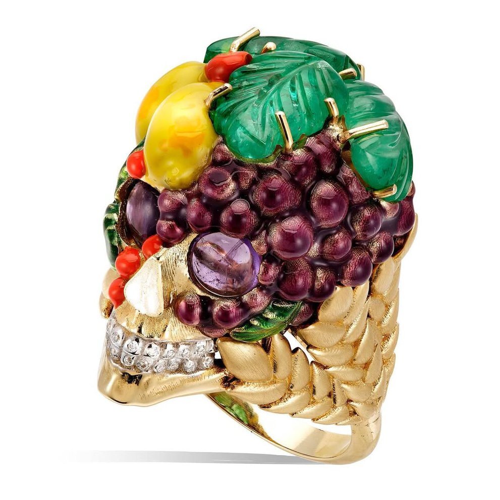 Кольцо Memento Mori из желтого золота от Lydia Courteille с изумрудами, аметистами, бриллиантами; частично золото покрыто эмалью.