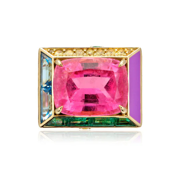Центральным камнем является рубеллит огранки «кушон» весом 20,45 карата с желтыми сапфирами, швейцарским голубым топазом. Лимон, кварц и изумруд.