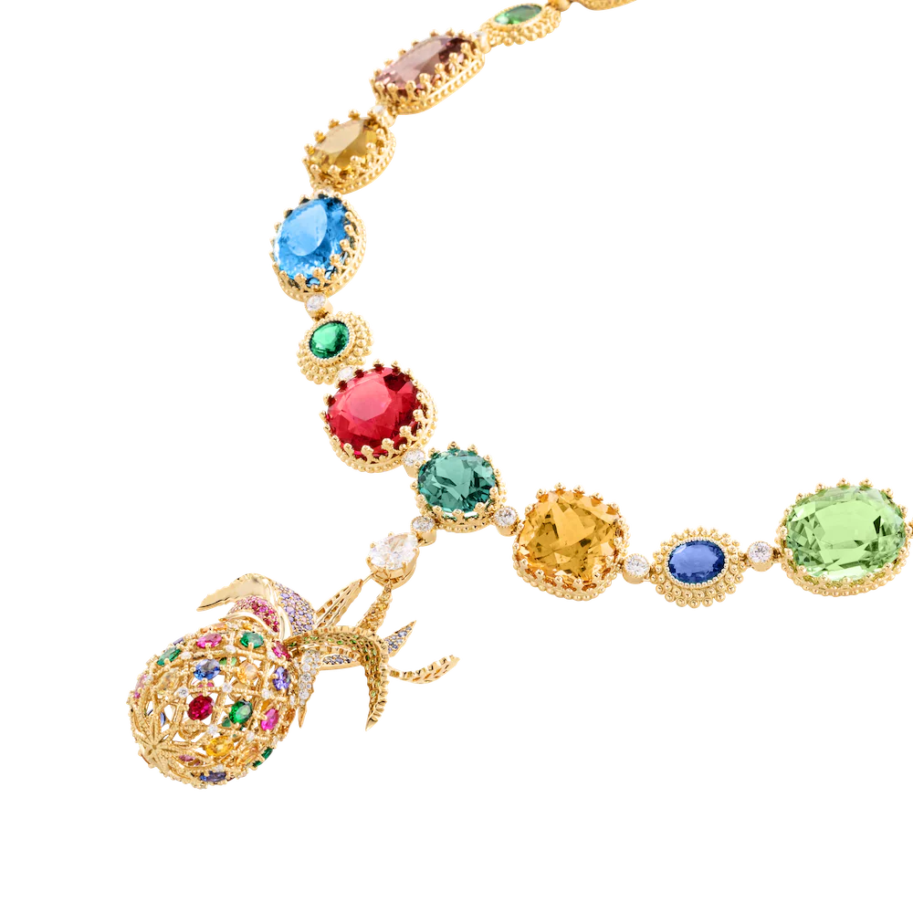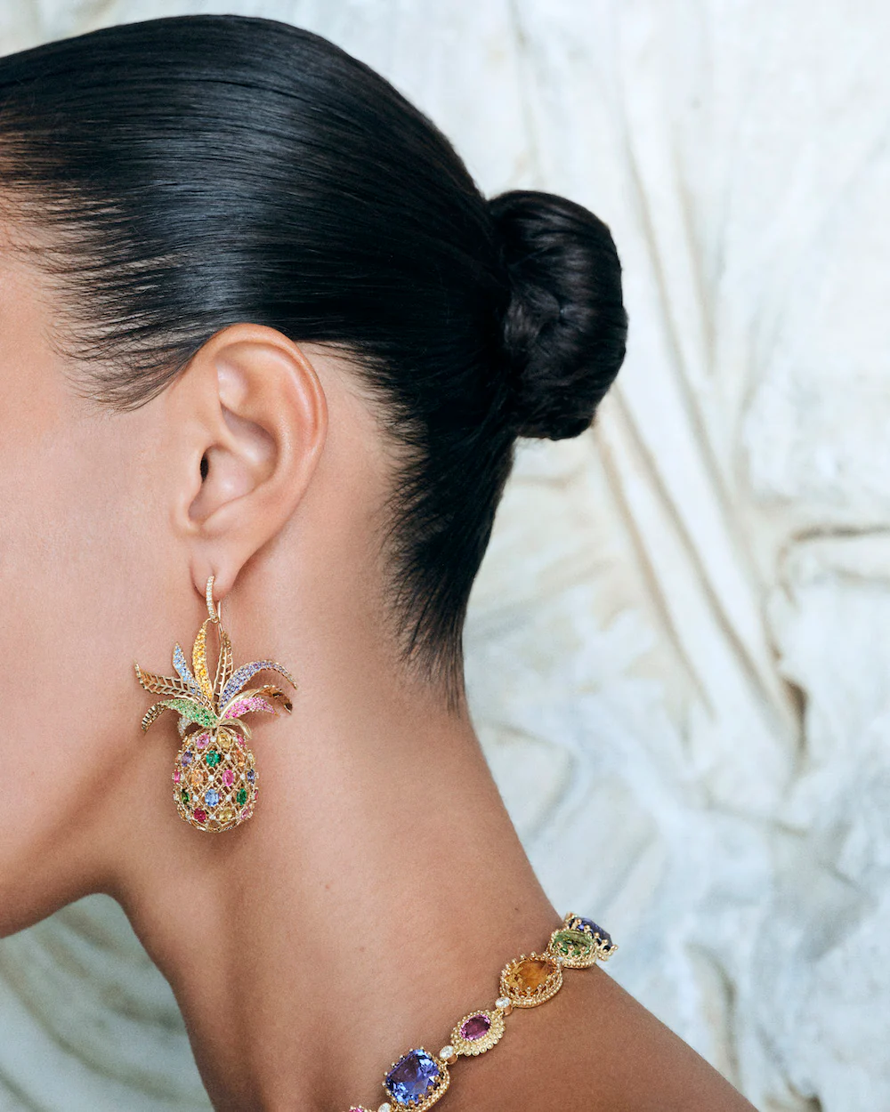 Вдохновленная утонченным вкусом и беззаботной жизнерадостностью королевы, Лора-Изабель Меллерио, художественный руководитель Mellerio, стремилась воплотить в ювелирных изделиях образ роскошного сада, вытканный на гобелене «Большой ананас», некогда украшавшем личные покои Марии-Антуанетты в Версале. Для королевы, которая однажды сказала: «Нет ничего слишком прекрасного», ананас, центральный мотив гобелена, запечатленный на картине Жана-Батиста Удри, символизировал королевскую власть, как король фруктов.