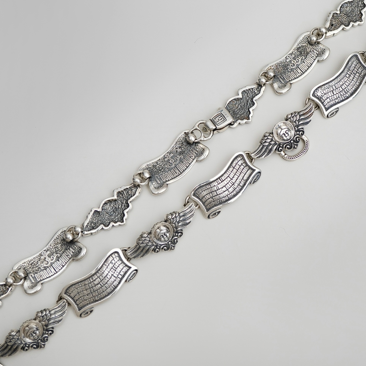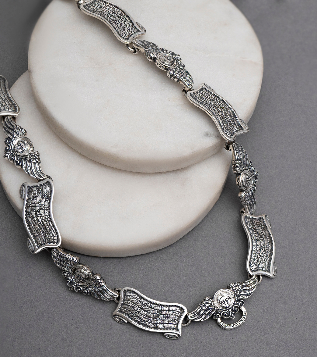 Каждое звено цепи — это не просто элемент украшения, а своего рода свиток с фрагментом священного текста, обрамлённый образами херувимов — вечных стражей и посланников Божьих.