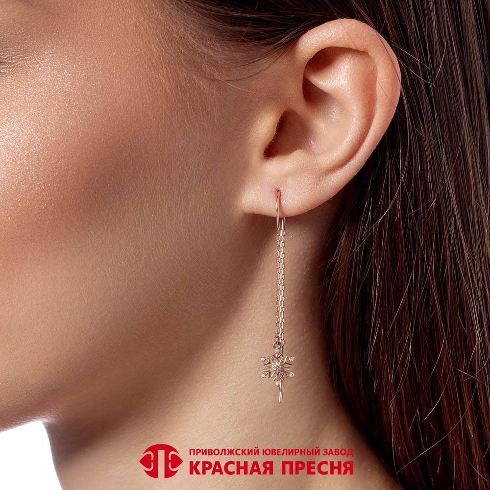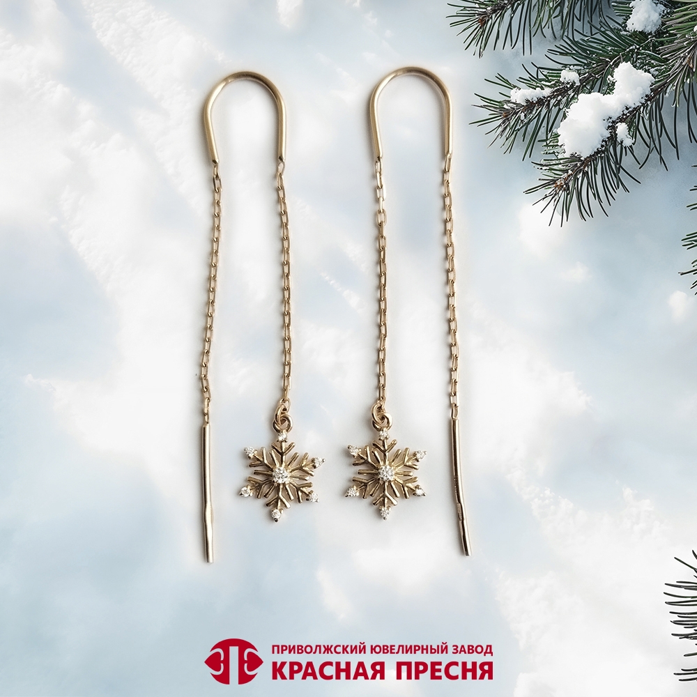 Выполненные из благородного золота 585 пробы, эти украшения словно оживают благодаря игре света в бесцветных фианитах. Каждая вставка преломляет лучи, рассыпая вокруг себя каскад искр всех цветов радуги – настоящее воплощение зимней магии.