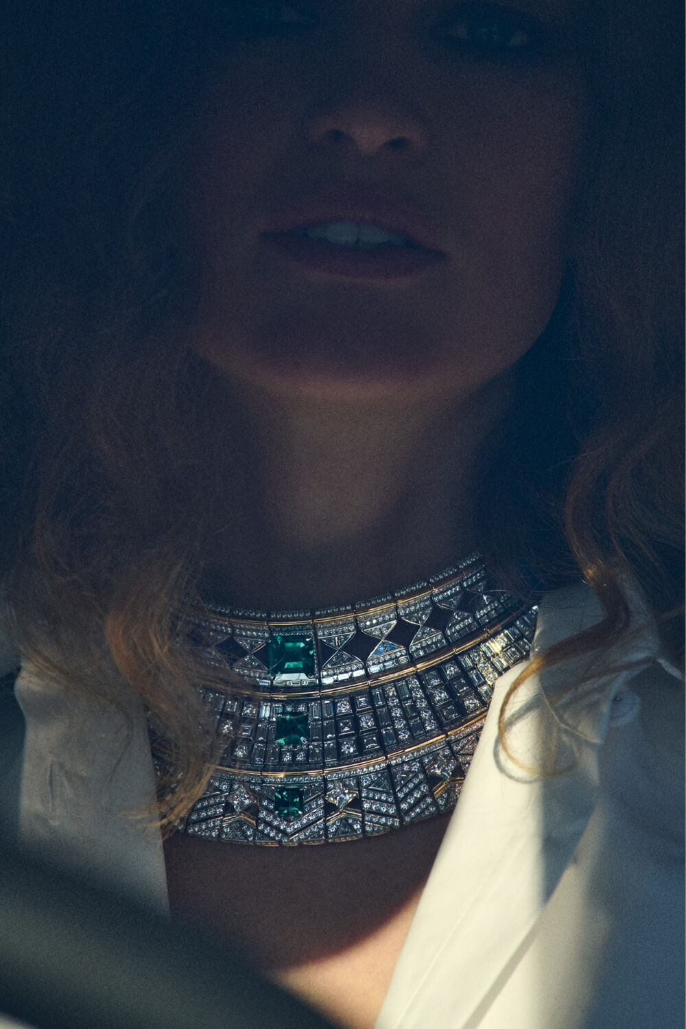 По мере развития коллекции, включающей Maestria и Monumental, мастерство LV достигает головокружительных новых высот. Колье Maestria – геометрический шедевр, инкрустированный тремя сверкающими колумбийскими изумрудами и 2500 бриллиантами – является впечатляющим достижением точности, в то время как изделия Monumental, украшенные 320 камнями, включая изумруды, рубины и бриллианты, демонстрируют тонкий баланс между структурой и легкостью. Но истинная вершина достигается в Apogée, где 30,75-каратный бразильский изумруд, обрамленный бриллиантовыми ручками, вдохновленными знаменитыми сундуками Дома, венчает техническое совершенство коллекции.