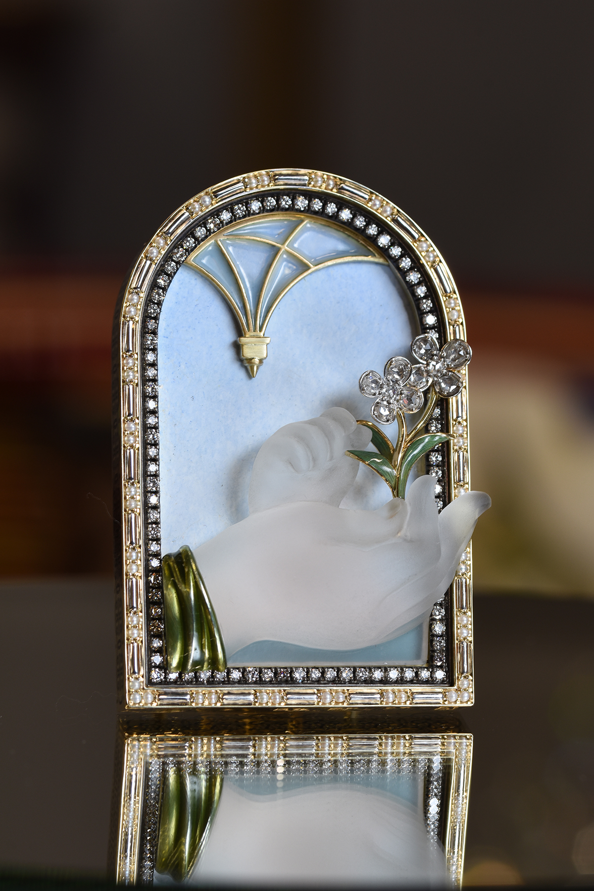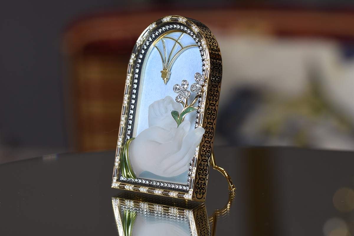 Композиция «Крестоцвет» по мотивам работы Леонардо Да Винчи «Мадонна Бенуа» (Мадонна с цветком) выполнена с использованием камнерезной техники, горячей витражной эмали, ручной гравировки по металлу и техники закрепки ограненных камней.