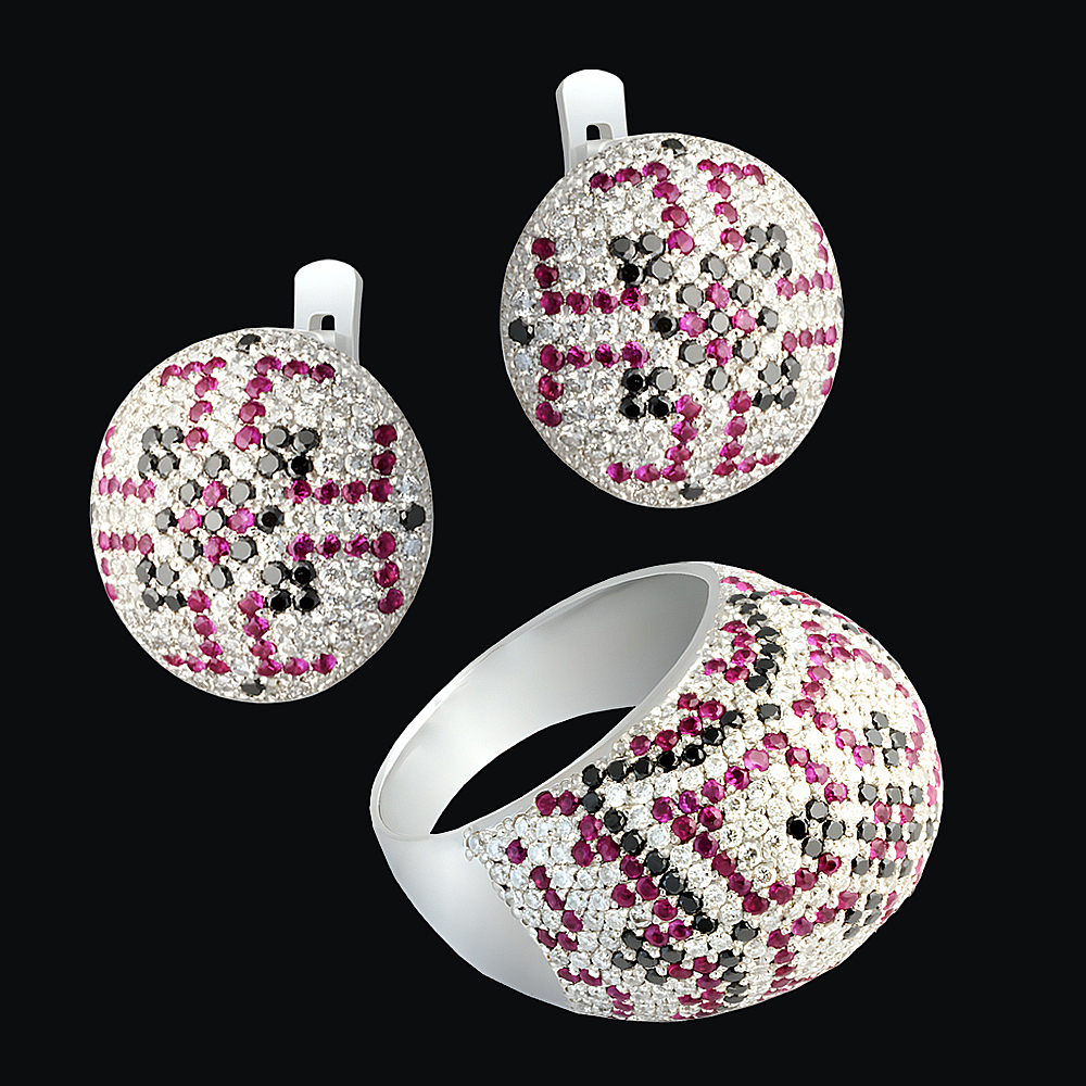 Гарнитур «Вышивка» — это ода этим традициям. Каждая его деталь, от серег до кольца, является воплощением изящества и утонченности. Наши ювелиры, виртуозно владея техникой микропаве, словно вышили на золотом полотне дивные узоры. Белые и черные бриллианты искусно переплетаются с огненными рубинами, создавая завораживающий танец света и контраста.