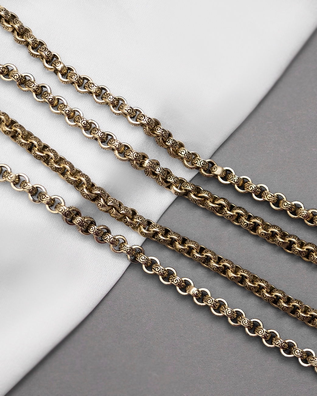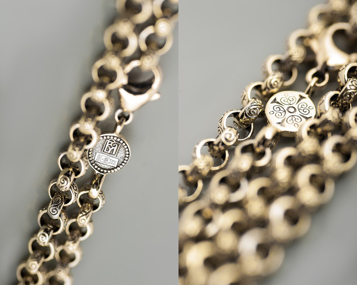 В каждой модели оживает традиция древнерусской мелкой пластики: сложные узоры отсылают к средневековым рукописям и фрескам, а ручная работа наполняет изделие душой ремесла. Носить такую цепь – значит ощущать на себе вес традиции и изящество её современного прочтения, выбирая диалог с историей, запечатленный в драгоценном металле.