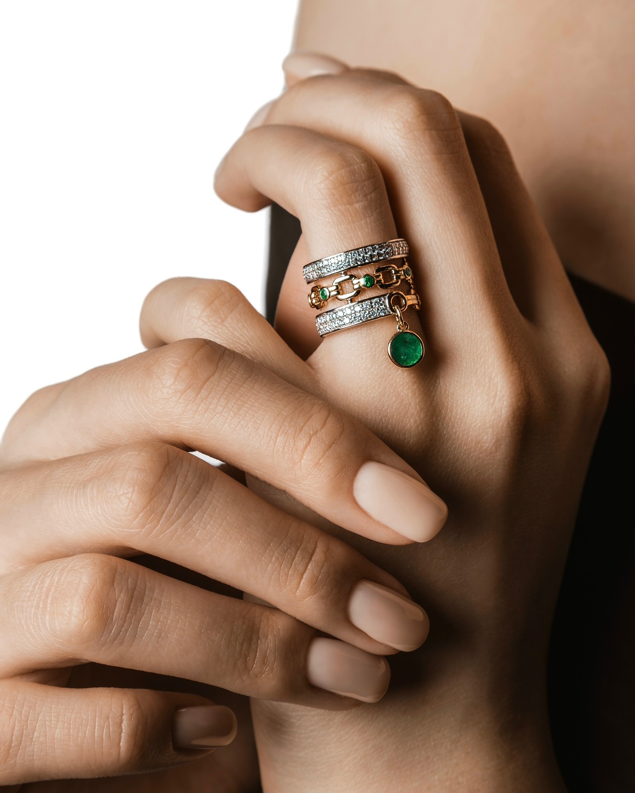 Эффектное кольцо из коллекции NIGHTSHADE построено на этой идее: бриллиантовые дорожки создают основу, звенья из желтого золота становятся центральным акцентом, а изумруды добавляют цвет.