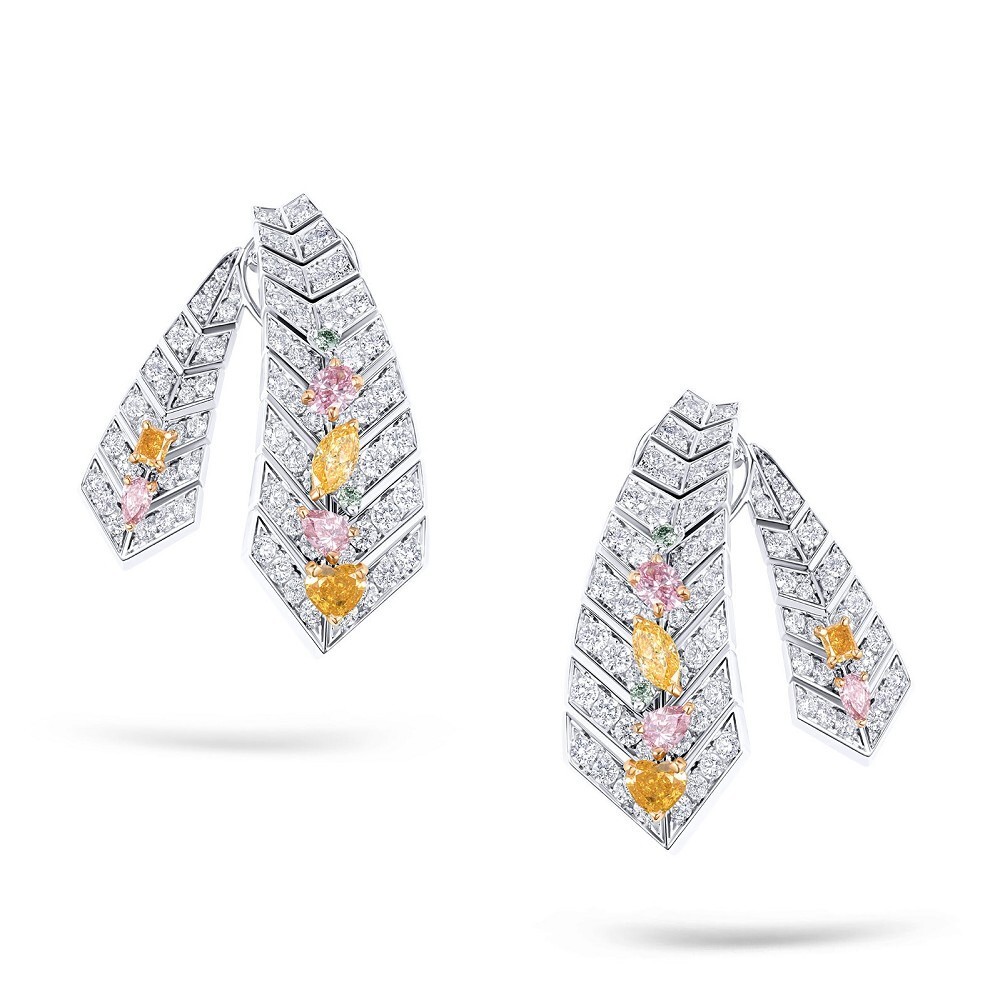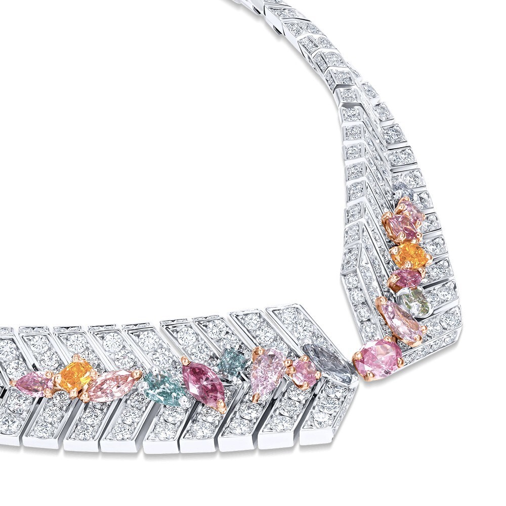 Среди изделий с цветными бриллиантами наиболее ярким является колье Fearne, выполненное из белого золота и инкрустированное бесцветными бриллиантами, создающими листья папоротника с естественными изгибами. Семнадцать цветных бриллиантов, разбросанных по стеблям, становятся ярким акцентом — от ярко-синих и зеленых бриллиантов до высококачественных пурпурно-розовых и желто-оранжевых бриллиантов, создающих эффект бриллиантовой радуги вокруг шеи.