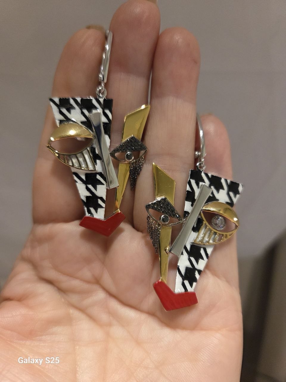 Каждая серьга – это миниатюрное произведение искусства, где лицо человека предстает в характерной для Пикассо манере. Геометрические линии, смещенные пропорции и выразительные детали создают неповторимый образ. В дизайне гармонично сочетаются классический принт «гусиная лапка», который придает серьгам элегантность и шик, с яркими акцентами. Золотистые веки, стилизованные ресницы и ярко-красные губы добавляют динамики и выразительности, притягивая взгляды.