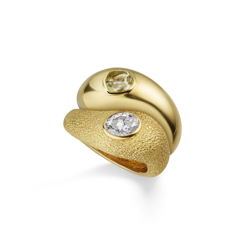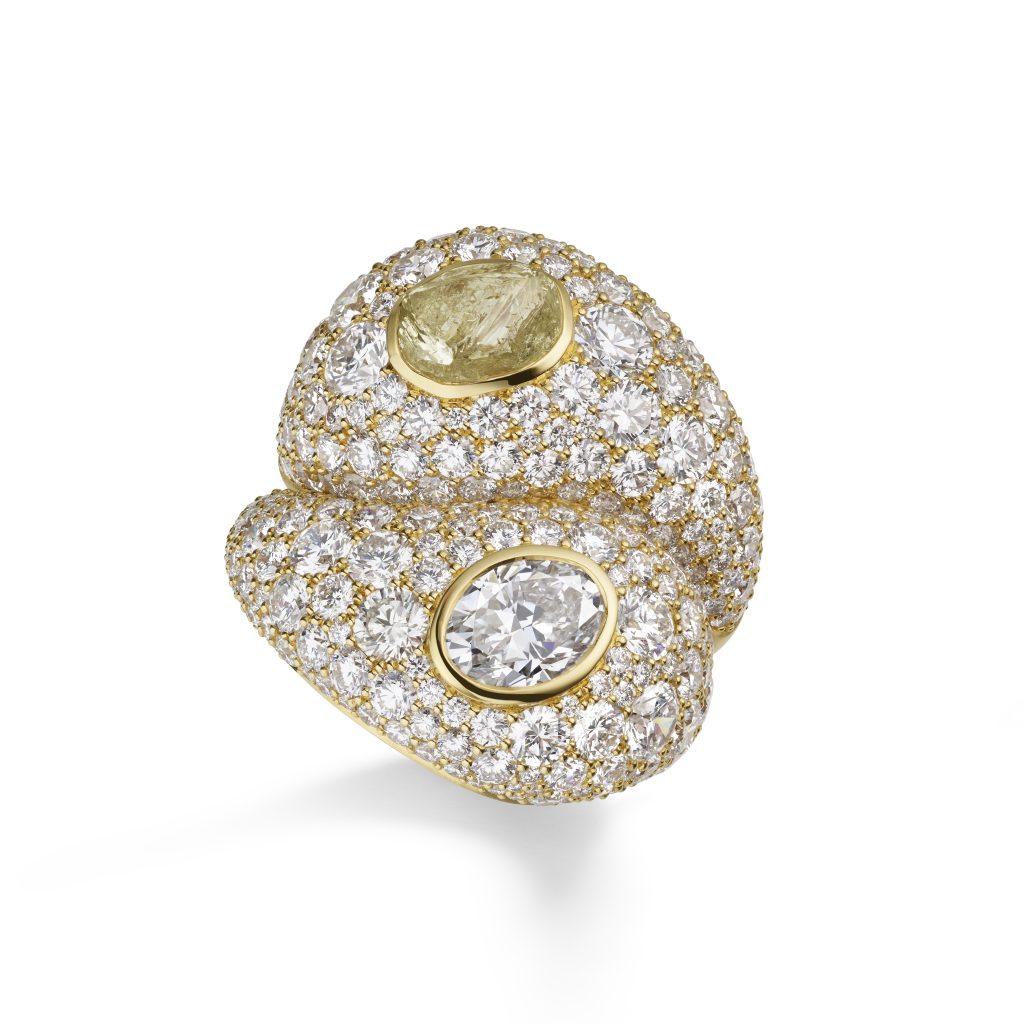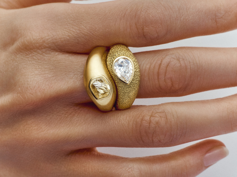 Центральное место в коллекции занимает набор из восьми колец Toi & Moi из 18-каратного желтого золота. Они сочетают полированные камни грушевидной или овальной формы с необработанными бриллиантами. Шесть колец украшены контрастными переплетенными полосами: одно выполнено из матового золота, другое — с гравировкой во флорентийском стиле. Два дополнительных кольца Riverborn Toi & Moi отличаются изысканной «снежной инкрустацией» бриллиантов на поверхностях из 18-каратного желтого золота, создающей игру света. В одном из них бриллиант грушевидной огранки соседствует с 271 бриллиантом, а в другом — камень овальной огранки с 282 бриллиантами.