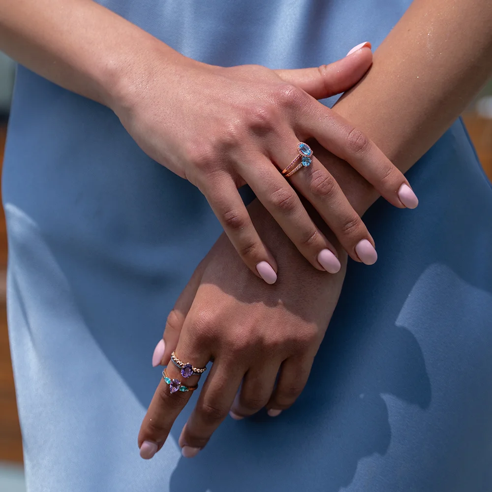 А выразительное красное золото – это тот самый акцент, который делает это кольцо по-настоящему особенным. Его тёплый, насыщенный оттенок усиливает контраст с нежным топазом, создавая завораживающий эффект солнечных бликов, играющих на поверхности воды.