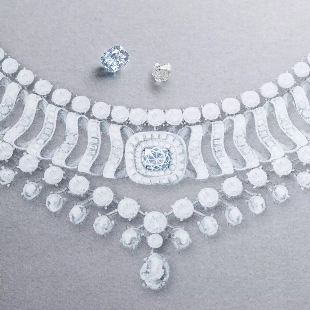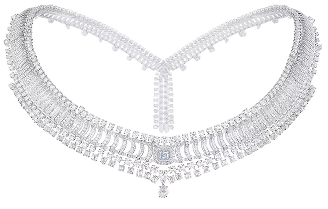 Вокруг центрального камня располагаются бриллианты круглой и багетной огранки, создавая завораживающие волнообразные узоры, словно многослойные ряби на воде. Ниже, словно водопад, ниспадают полированные необработанные бриллианты, играющие с естественным светом и тенью. Общий вес бриллиантов в композиции превышает 193 карата. Уникальная гибкая конструкция колье позволяет трансформировать его: кольцо можно отсоединить и использовать как тиару, а браслет и серьги дополнены изящными кисточками.
